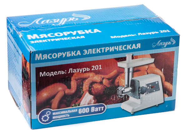 Brand Лазурь 201 попадает на прилавки магазинов в небольшой картонной коробке. Основной фон, под стать названию модели — голубой. Дизайн боковых и длинных сторон дублирован. Сбоку просто перечислены основные технические характеристики. На основной стороне изображена мясорубка на фоне натюрморта из мясных блюд, преимущественно колбасных. В целом, это выглядит очень достойно для бюджетной модели.