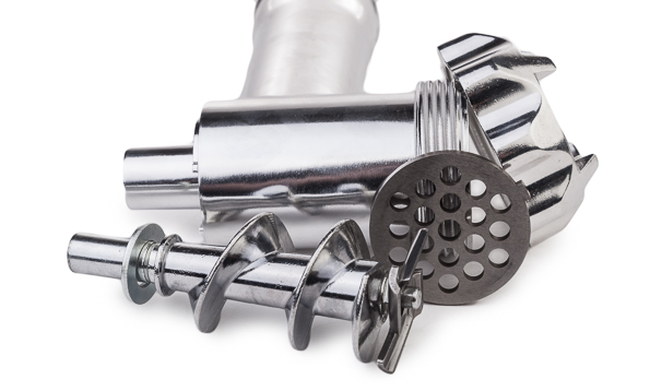 Протестировав несколько мясорубок, мы принимаем за стандарт насадку, идущую в сборе. Развинтив, получаем: накатную гайку, решетку со средним диаметром, червячный вал и стальной нож.