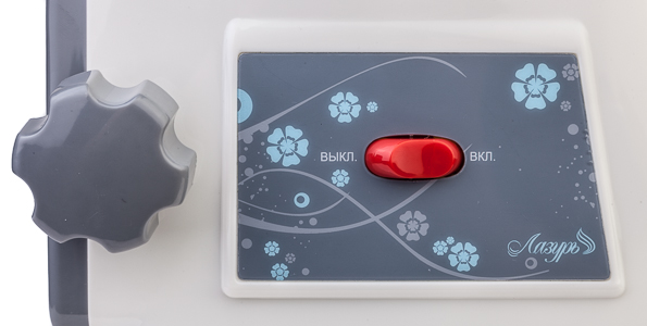 Включается мясорубка с помощью красного пластикового рычажка на лицевой стороне прибора. Переключение четкое, при нажатии происходит характерный для советских выключателей щелчок. При этом положение «вкл» и «выкл» неоднозначное. Слева и справа от кнопки есть соответсвующие надписи, но напечатаны они мелким шрифтом и к ним приходится приглядываться.
