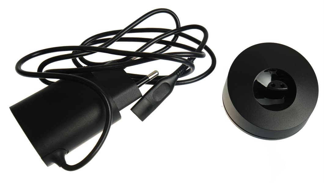 Док-станция представляет собой небольшой постамент, сделанный из матового пластика. Зарядное устройство — включается в обычную электрическую зарядку и имеет длину шнура 1,2 м.