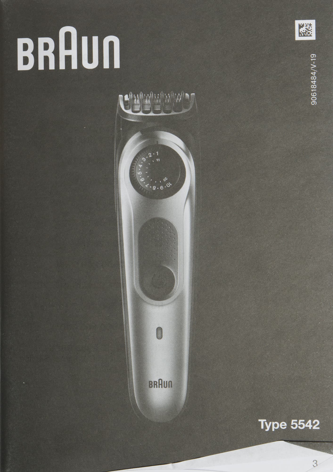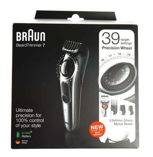 Триммер поставляется в небольшой картонной коробке, оформленной в фирменном стиле Braun: черный фон, фотография устройства, описание его основных особенностей и характеристик.