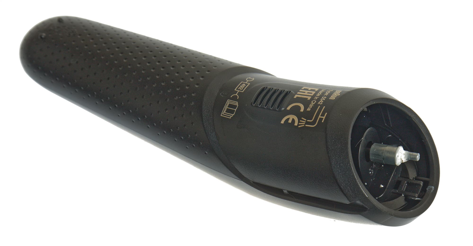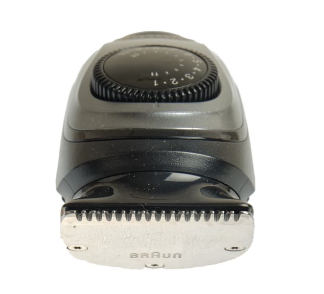 На лицевой стороне устройства мы видим небольшую зону захвата (под большой палец) с кнопкой запуска триммера. Под ней — светодиодный индикатор, ниже — логотип Braun.