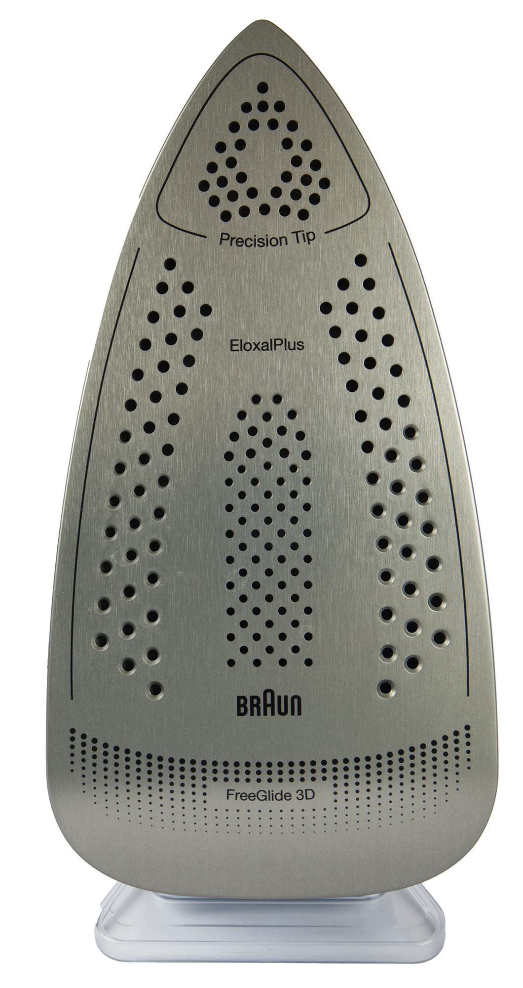 Подошва 3D Eloxal изготовлена из анодированного железа со сложным расположением отверстий для выхода пара. Запатентованная форма подошвы изготовлена по принципу скейтборда. Закругленный задник облегчает движения утюгом в разные стороны. Гладить можно как вперед, так и назад, не опасаясь заломов и складок от подошвы на ткани.