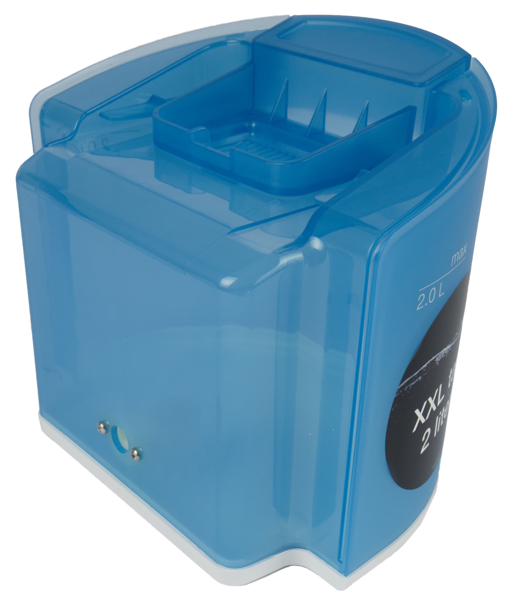 Резервуар для воды без усилий вынимается и вставляется в базу прибора. Подача воды осуществляется через специальное отверстие с клапаном, к которому присоединяется ответная часть базы. Клапан не подтекает. Сверху резервуара находится съемная часть, которую можно отделить от основной для удобства чистки емкости внутри. Заливание и выливание воды можно производить, не разбирая резервуар, прямо через решетку, защищающую от попадания внутрь посторонних предметов.