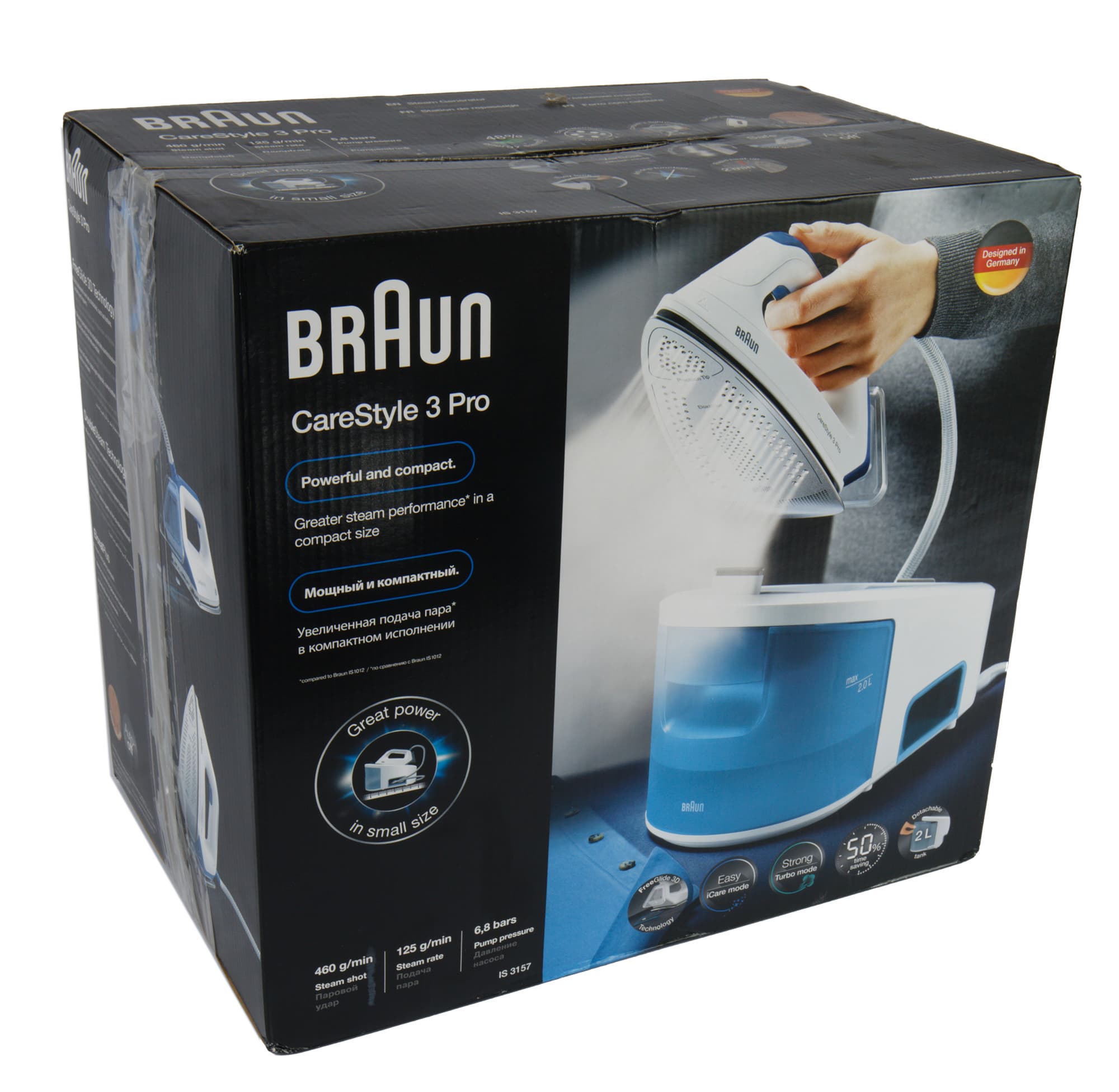 У нас на тестировании парогенератор Braun IS3157BL CareStyle 3 Pro, способный, по заявлению производителя, подавать пар, достигая давления 6,8 бар со скоростью 125 г в минуту. Устройство оснащено съемным резервуаром для воды на 2 литра, функцией вертикального отпаривания и парового удара, программой самоочистки и анодированной подошвой утюга, по форме напоминающей скейтборд, для легкого движения в любую сторону. Попробуем получить удовольствие от тестирования этого прибора.