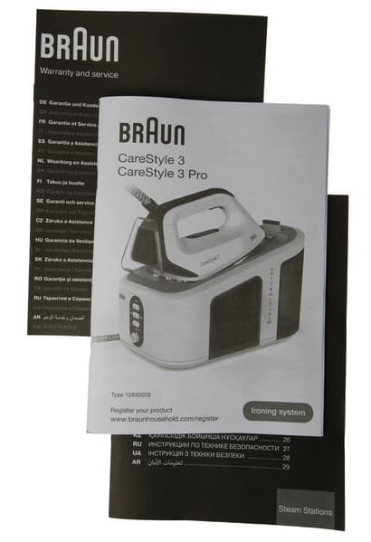 Руководство пользователя напечатано сразу на 24 языках и имеет объем 66 страниц текста. На развороте обложки на трех страницах даны основные моменты эксплуатации прибора в рисунках. Они же потом пояснены в текстовой части. Возможно, перевод на русский язык был осуществлен автоматическим переводчиком, поэтому понять многие моменты инструкции довольно сложно. А некоторые функции прибора, например автоматическое отключение, разбор резервуара для воды или фиксация подачи пара, составители вообще обошли вниманием.