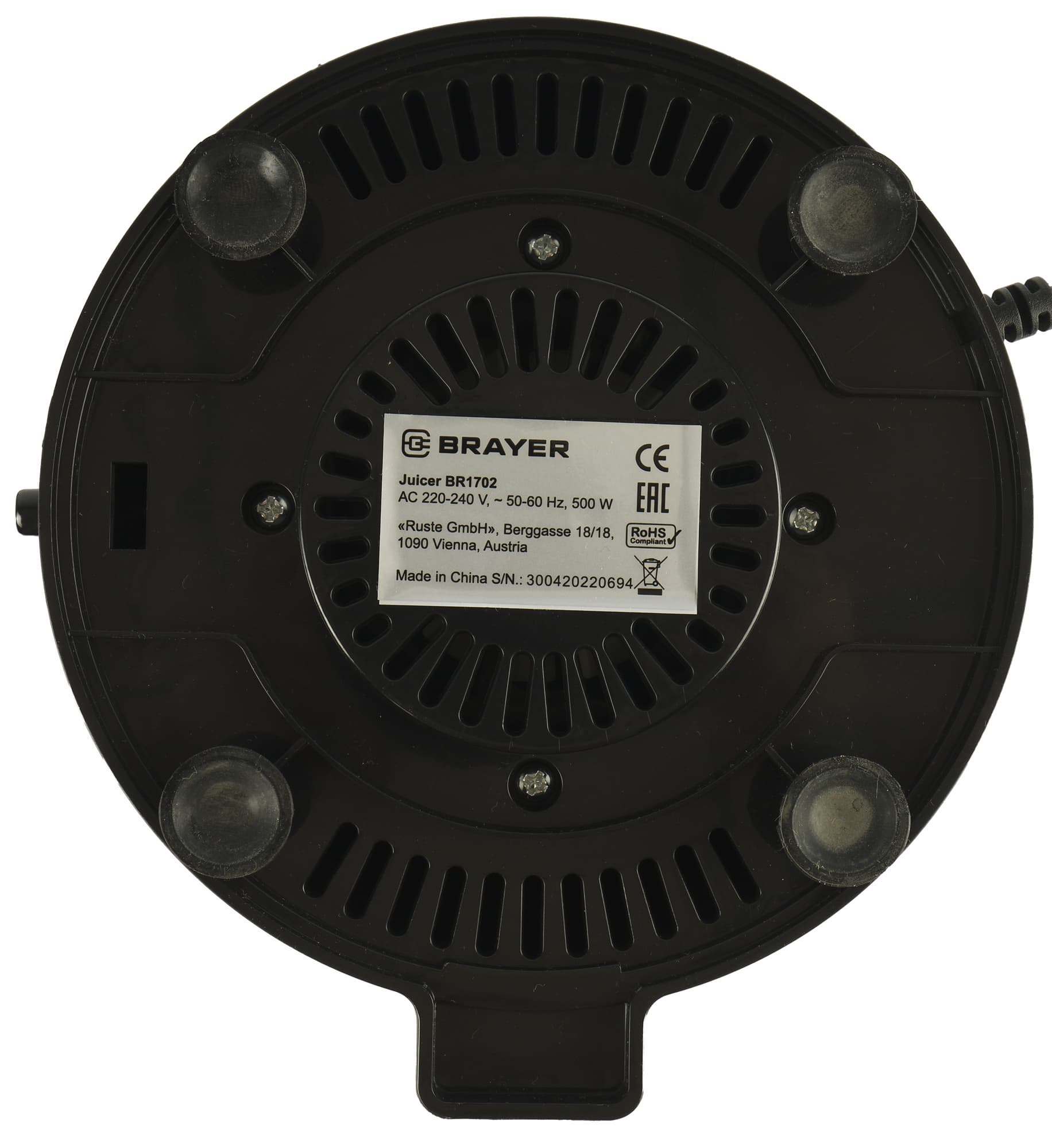 У Brayer BR1702 всё довольно стандартно: две скорости и один механический трехпозиционный переключатель. Первая скорость — низкая, вторая — максимальная, при переводе регулятора в положение 0 соковыжималка останавливает работу.