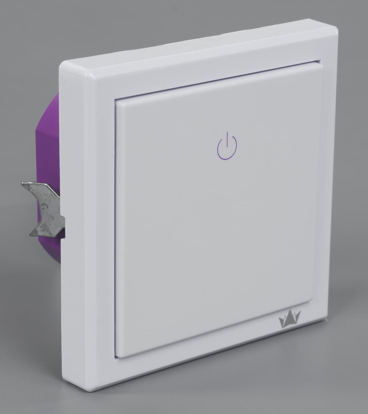 Сверху блок закрывается стандартной рамкой с одноклавишным выключателем без фиксации. В нашем случае внешняя часть была изготовлена из белого глянцевого пластика, но существует и два темных варианта. Блок предназначен для использования в помещениях и позволяет коммутировать нагрузку 300 Вт.