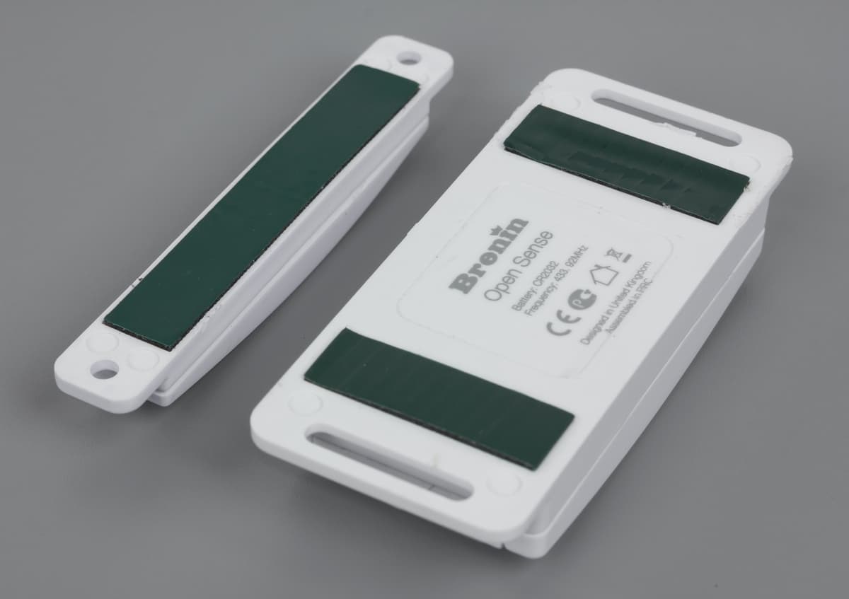 Датчик для двери состоит из двух элементов — блока с магнитом (12×11×81 мм) и блока с герконом и электроникой (35×15×82 мм). Расстояние срабатывания составляет около одного сантиметра. Изготовлены они из белого глянцевого пластика.