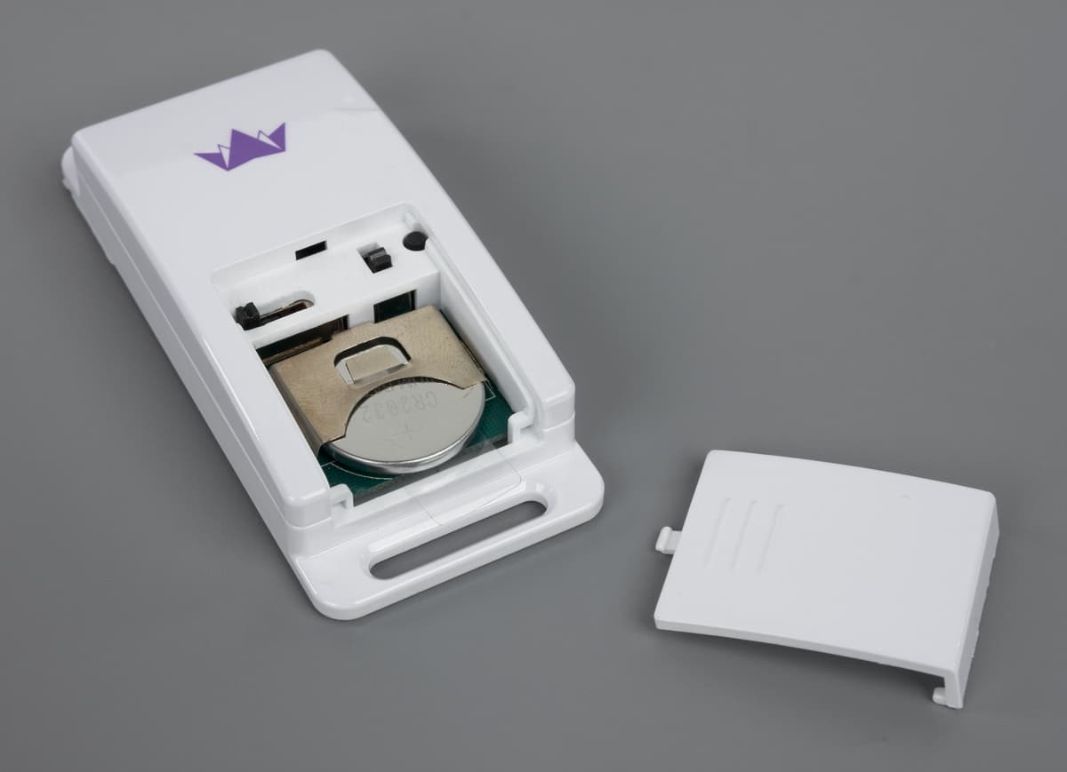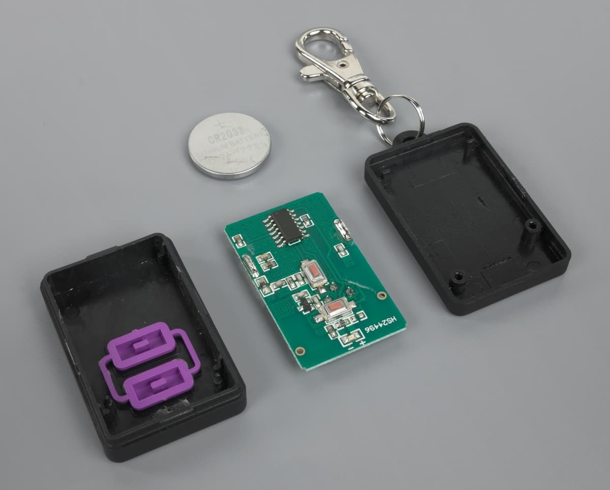 Кнопки при этом фиолетовые. Над ними находится яркий синий индикатор, а с противоположной стороны — кольцо для крепления цепочки с карабином. Питание осуществляется от батареи CR2032, для замены которой потребуется открыть половинки корпуса, которые держатся на защелках.