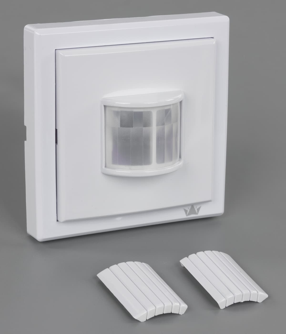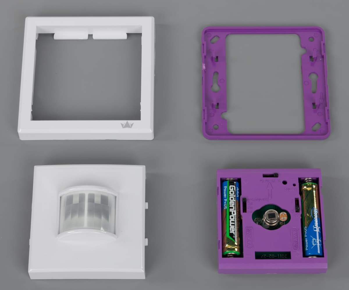 Комнатный сенсор движения имеет внешний формат аналогичный современным выключателям и розеткам — 80×80 мм. Однако может быть установлен на плоскую поверхность (стену) в любом месте, поскольку вся электронная начинка находится во внешней части (ее высота — около 30 мм). Корпус изготовлен из белого глянцевого пластика. Кроме такого варианта, есть еще два цветовых решения.