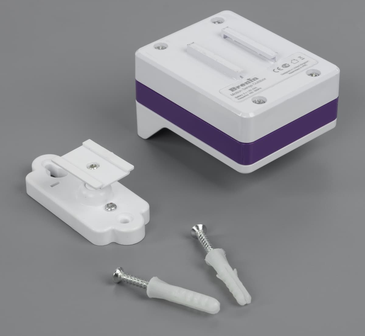 Ориентированный на уличную работу (защита IP54) датчик движения имеет корпус из крепкого глянцевого пластика размером 60×45×75 мм без учета крепления. В качестве последнего используется специальный шарнир, который устанавливается на вертикальную поверхность парой комплектных шурупов.