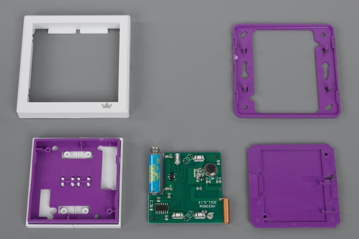 Под крышкой можно найти несколько регуляторов — длительности сигнала (6, 15, 60 и 300 секунд), внешней яркости (на четыре положения), кода передатчика (три положения и автоматический выбор). Также здесь есть служебный индикатор и кнопка сопряжения. Последняя в этой модели требует скрепки или другого тонкого предмета для использования. Процесс разборки показался не самым простым — возможно, стоило как-то изменить конструкцию защелок. Впрочем, часто обращаться к настройкам, скорее всего, не придется, а проверить работу можно и при открытой крышке.