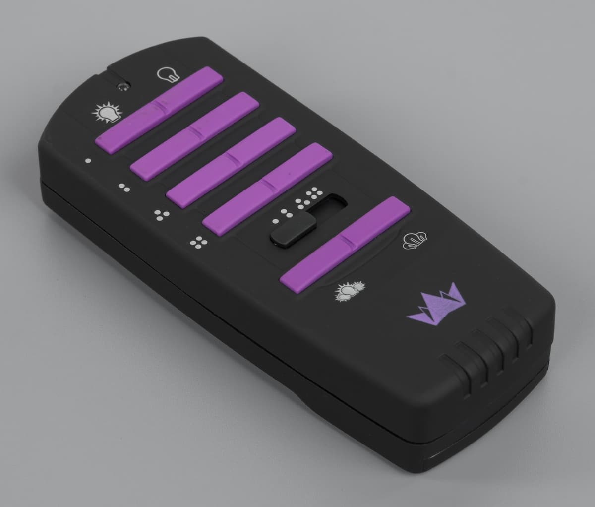 Более сложный пульт — Aide Comfort. Он имеет размеры 45×104×20 мм и также представлен в белом и черном вариантах (поставляются отдельно). Питание осуществляется от батареи A23S на 12 В. Эта модель поддерживает в общей сложности шестнадцать каналов — четыре пары кнопок могут быть использованы в четырех группах, устанавливаемых переключателем. Кроме того, предусмотрены кнопки «выключить/включить все», которые отправляют команды по всем каналам сразу.