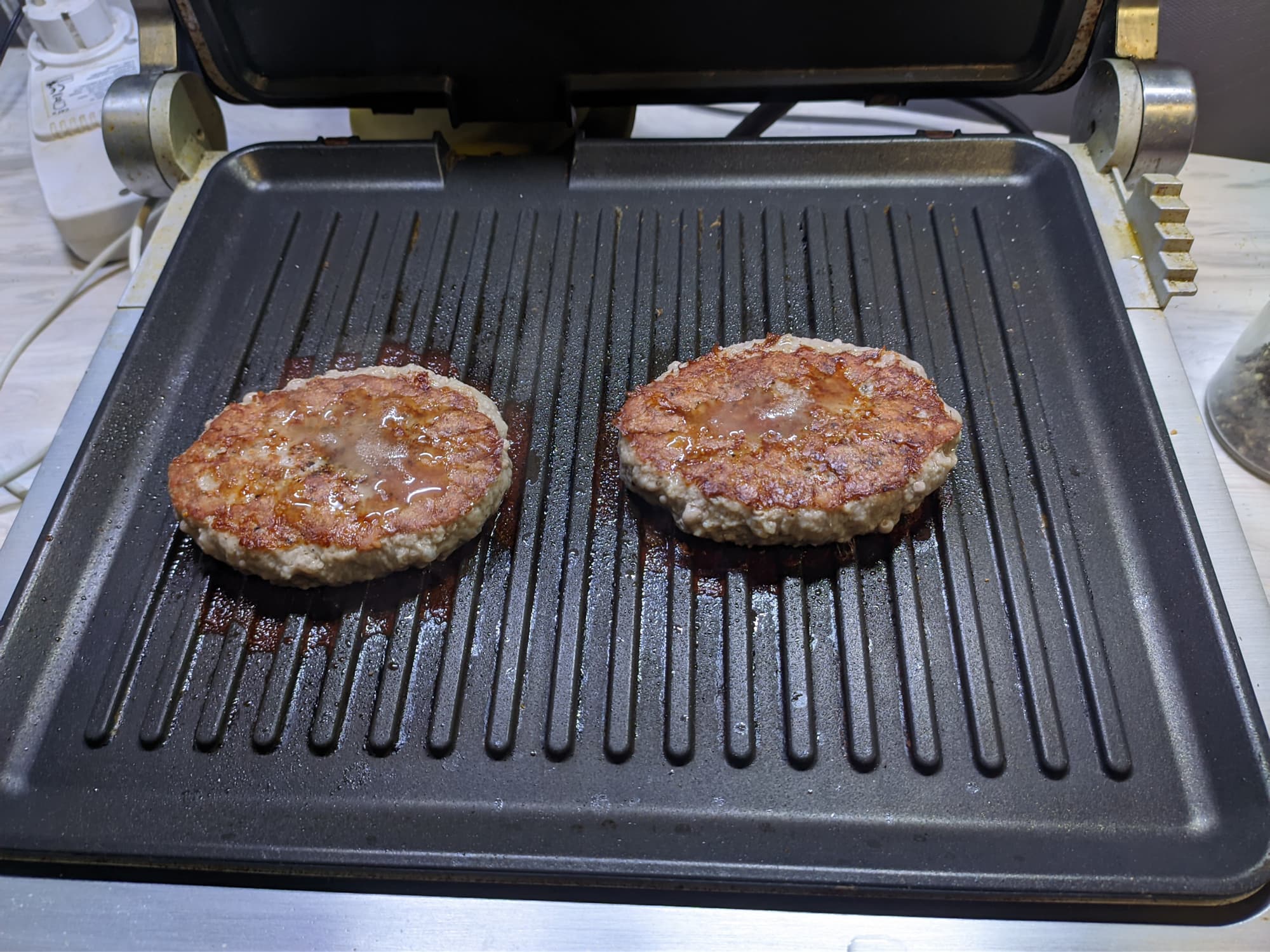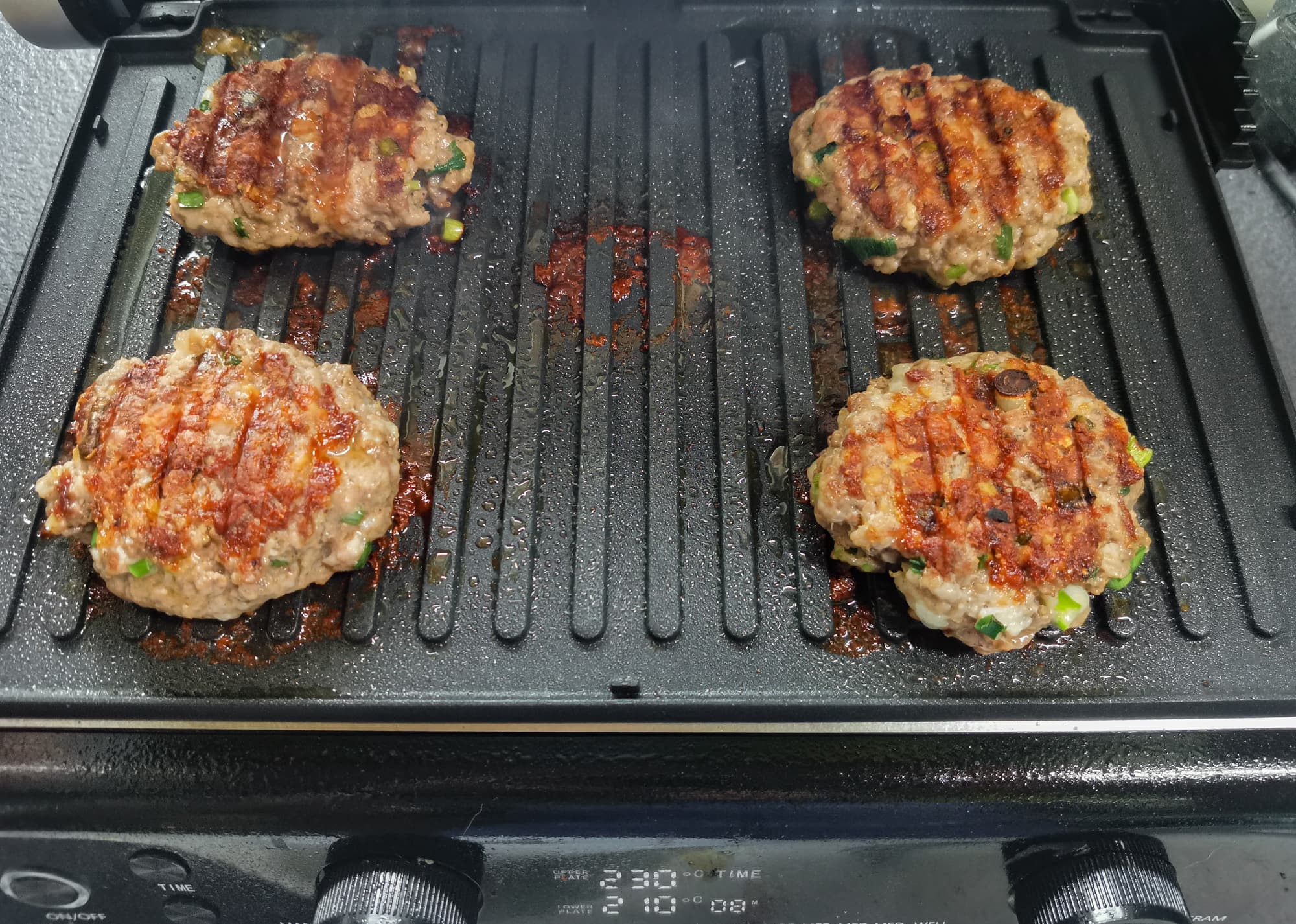 Для приготовления котлет-бургеров можно использовать гриль как в открытом положении жаровни, так и в контактном (закрытом) — всё зависит от желаемого результата, и с каждым конкретным прибором лучше поискать свой идеальный путь: положение пластин, температурный режим. Практика тестирования показывает, что не всегда режим, рекомендуемый производителем для бургеров, подходит, иногда надо увеличить температуру.