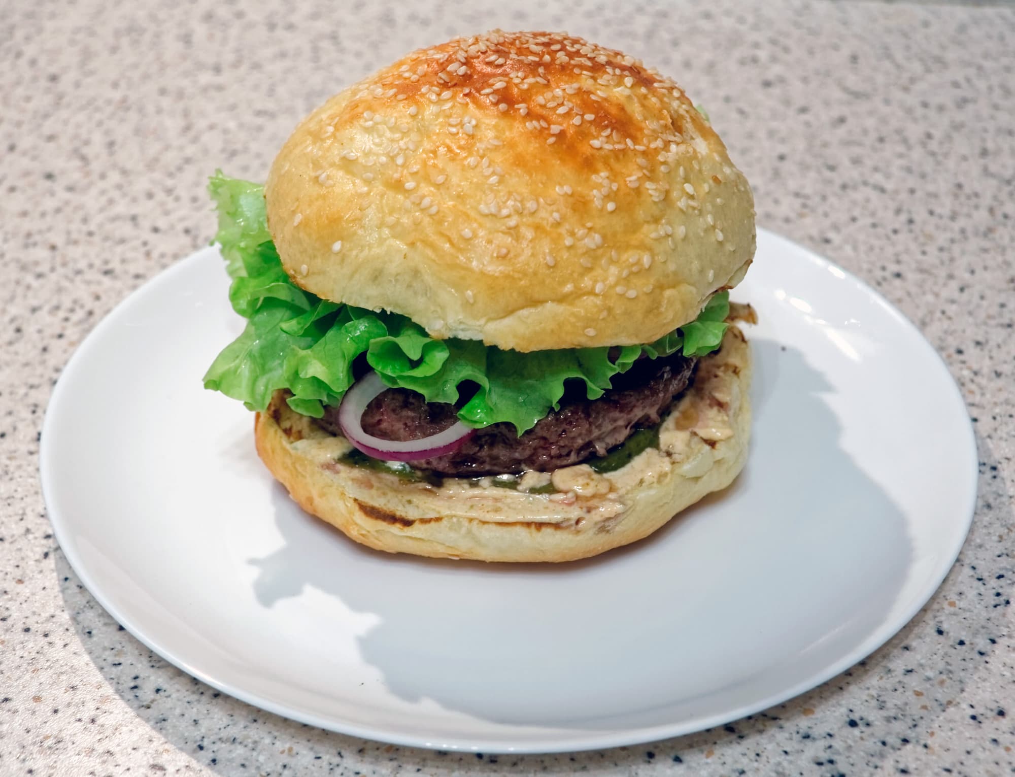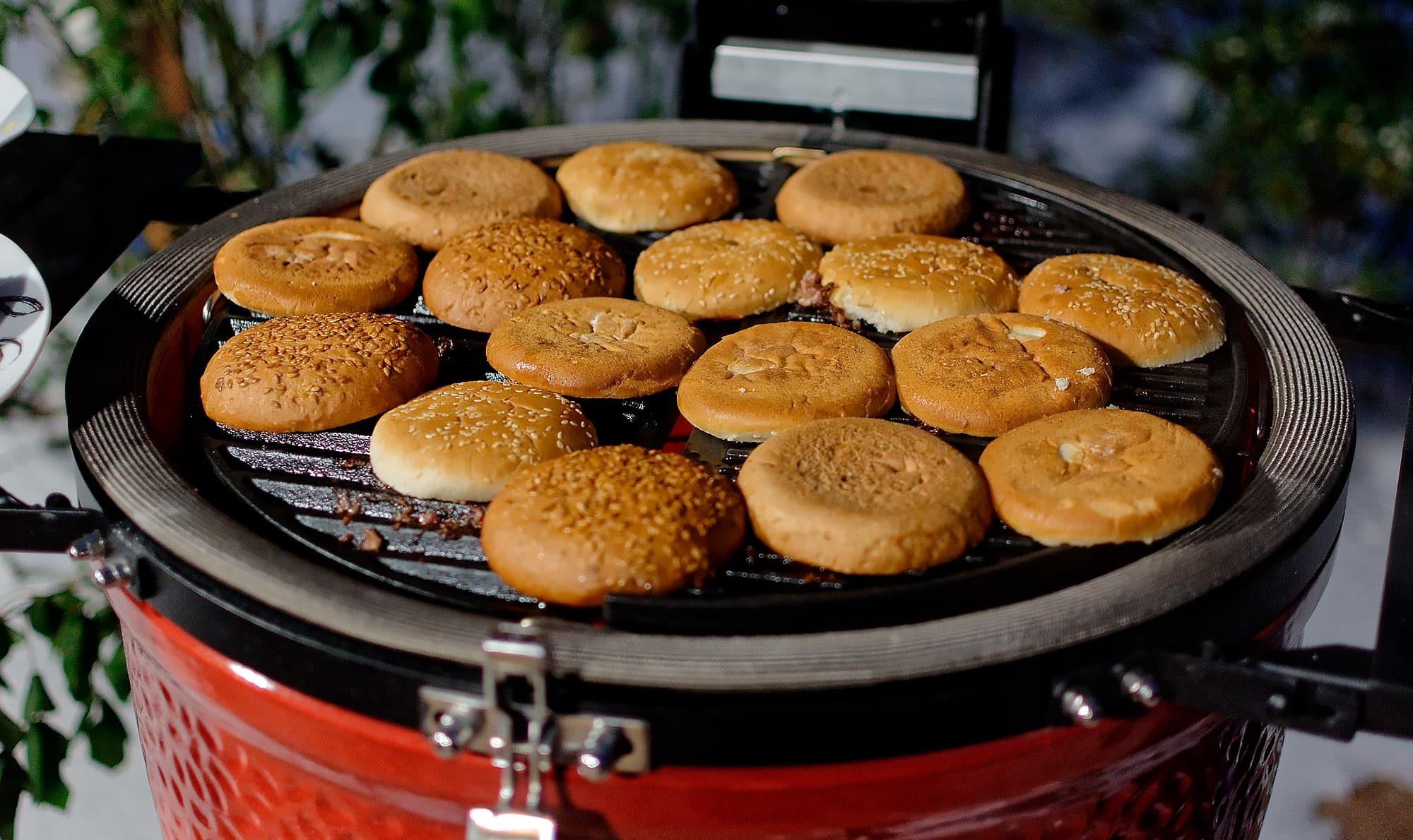 Результат: снаружи котлеты равномерно зажарились, внутри оказалась прожарка medium, даже ближе к medium well. В еще горячий гриль положили булочки, закрыв крышку, чтобы немного их сплющить. Булочки смазали соусом, добавили котлеты и овощи и… еле успели сфотографировать на память.