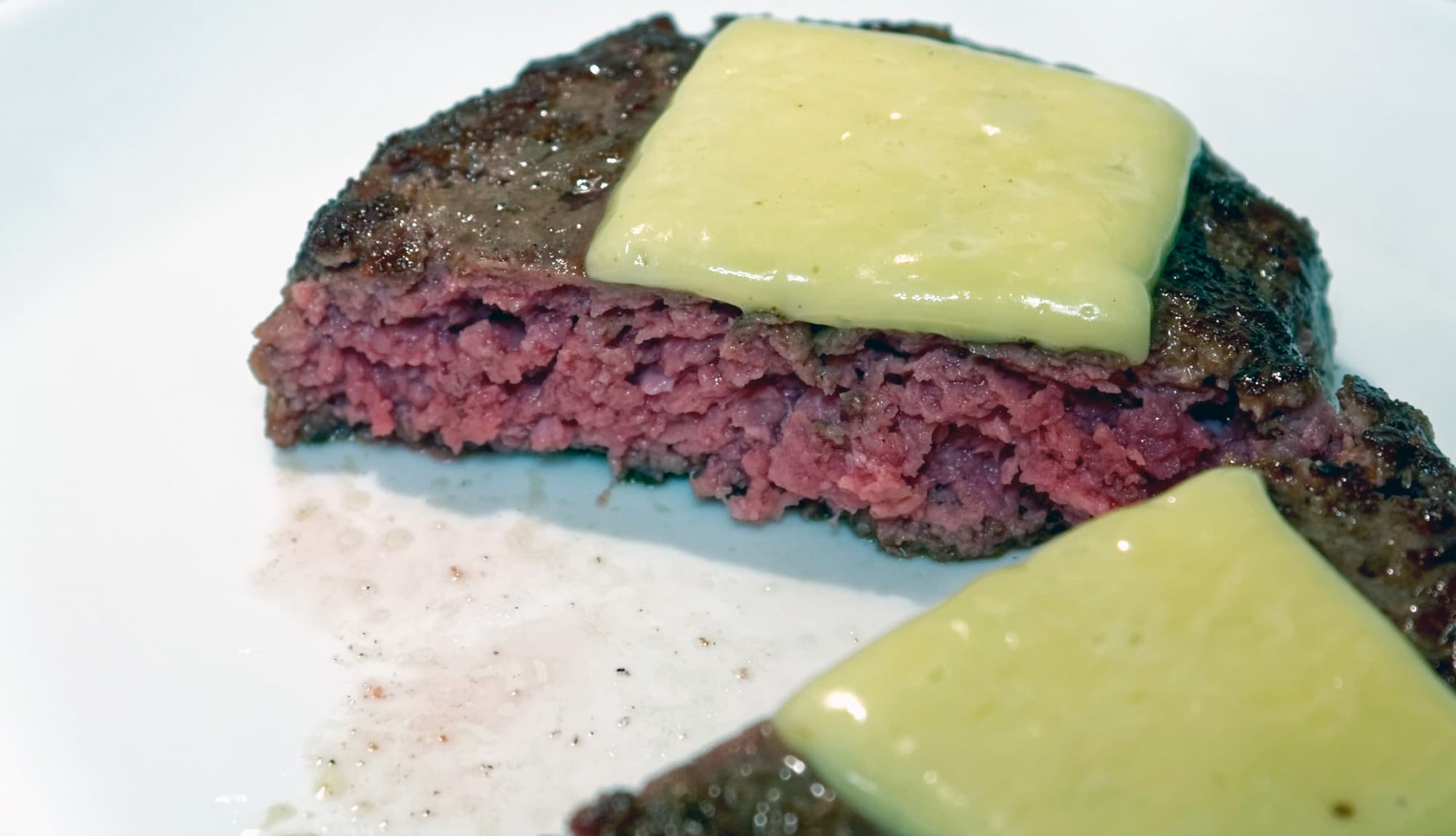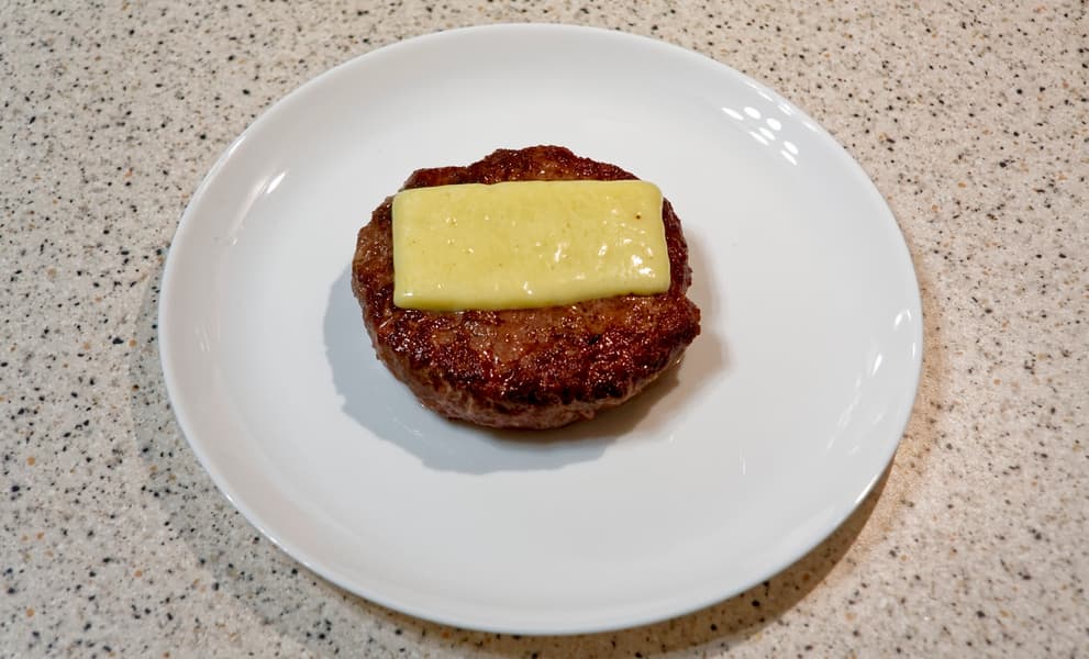 После извлечения котлеты из пакета ее требуется высушить с помощью бумажных полотенец — тогда, попав на сковороду или в гриль, она сразу же начнет обжариваться без сильного испарения жидкости. Обжарка займет менее минуты с каждой стороны, на котлету можно положить сыр. Обжаренный бургер получился именно таким, как было задумано: без сырого фарша внутри, но сочным и мягким. Цвет мяса оказался розовым с оттенком красного. Если нужен другой уровень прожарки, держите котлету в су-виде дольше.