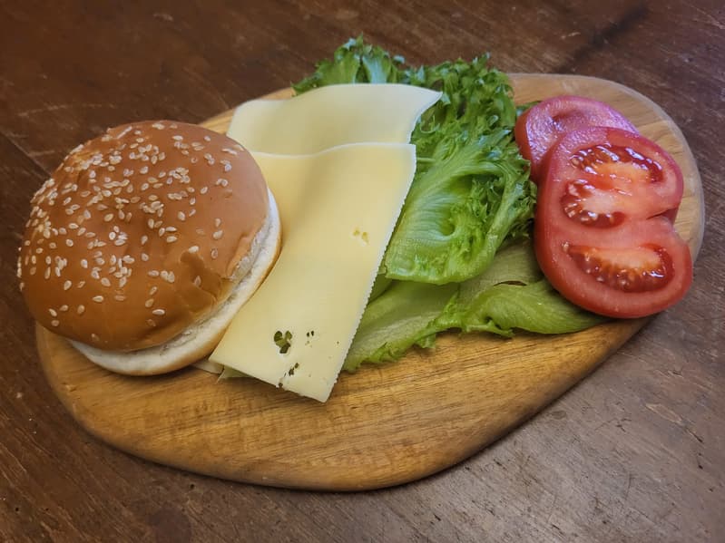 Тестируя небольшой бюджетный гриль Weissgauff WCG 250, мы готовили гамбургер следующим образом: взяли булочки для бургеров, взяли сыр, салат и помидор, подготовленную котлету положили на нижнюю пластину гриля, закрыли его, выставили автоматический режим для стейка и выключили через 4,5 минуты, поскольку увидели, что котлета поджарилась (специального режима для котлет нет, а рубленое мясо готовится быстрее стейка, для которого авторежим в этом гриле отводит 10 минут). Перевернули котлету, чтобы увидеть результат воздействия нижней нагревательной панели (видно на фото).