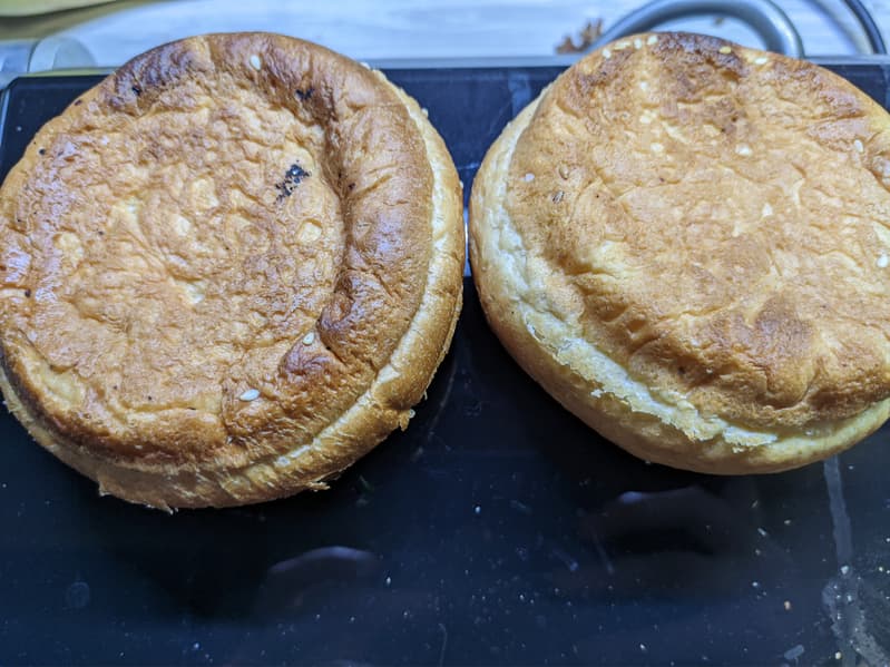 Когда-то мы и булочки для гамбургеров пекли самостоятельно, но всё же вечная нехватка времени и хороший выбор булочек (в том числе замороженных) в магазинах не способствуют таким кулинарным подвигам (разве что вафли сделали, но это другое). А вот размораживать булочки для бургеров нам нравится на решетке тостера. Например, так мы поступили, тестируя тостер Redmond T900 в режиме разморозки с 6 уровнями прожарки: то есть тостер сначала размораживает продукт, а потом немного обжаривает. Мы опробовали его на четвертом режиме и использовали решетку для подогрева выпечки, на которую и положили две замороженные булочки с кунжутом. Сначала тостер с одним длинным слотом показался нам не совсем удобным, но этот тест всё поставил на свои места: для булочек идеально. Конечно, можно и в духовке, и в СВЧ, но самый безопасный способ (нет риска сжечь, сделать мокрыми или пересушить) — на решетке тостера. На разморозку и подрумянивание булочек ушло 3 минуты 46 секунд. За это время они полностью разморозились, подогрелись снаружи и внутри, а снизу немного подрумянились.