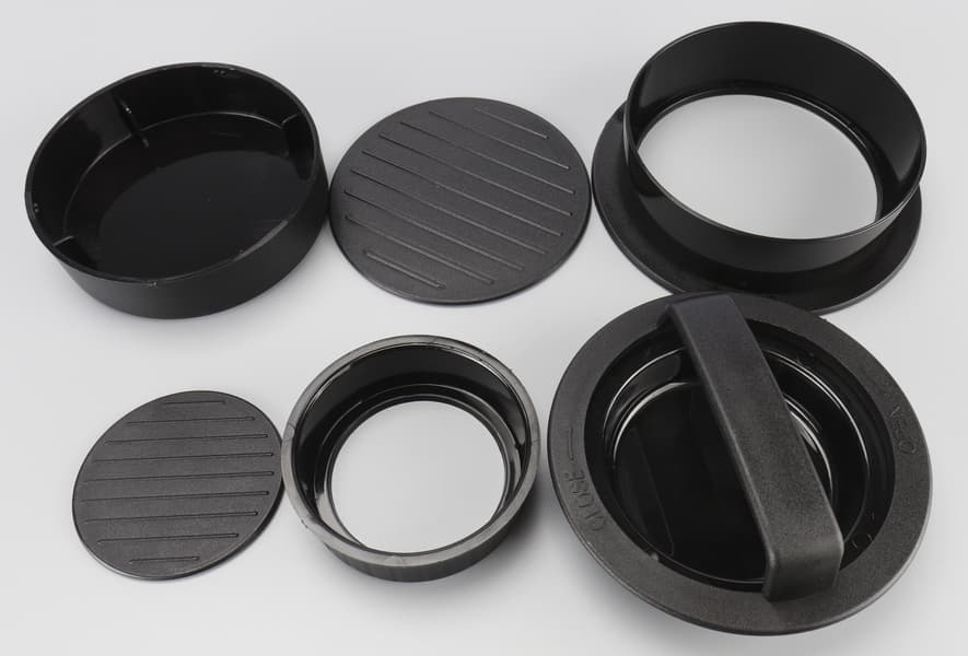 Пресс для бургеров у обеих моделей одинаковый и представляет собой две разборные пластиковые емкости и пластиковый пресс для легкого и быстрого формования котлет для бургеров и мини-бургеров. С помощью этого комплекта также можно готовить фаршированные котлеты (зразы).