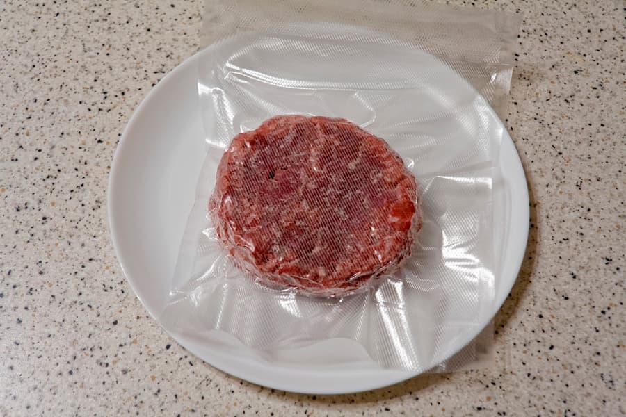 Тестируя погружной су-вид RawMid SVDM-01 (уже не продается, можно использовать любой, например Kitch Delvita или Inkbird ISV-100W), мы использовали как раз замороженные бургеры, упаковав их в вакуумные пакеты и поместив в горячую воду (выбрали среднюю степень прожарки, которая требует температуры в 54 °C). Для довольно толстых котлет весом более 200 г должно быть достаточно получаса. Мы добавили еще 30 минут с учетом того, что наши котлеты были заморожены, и не ошиблись: часа оказалось вполне достаточно.