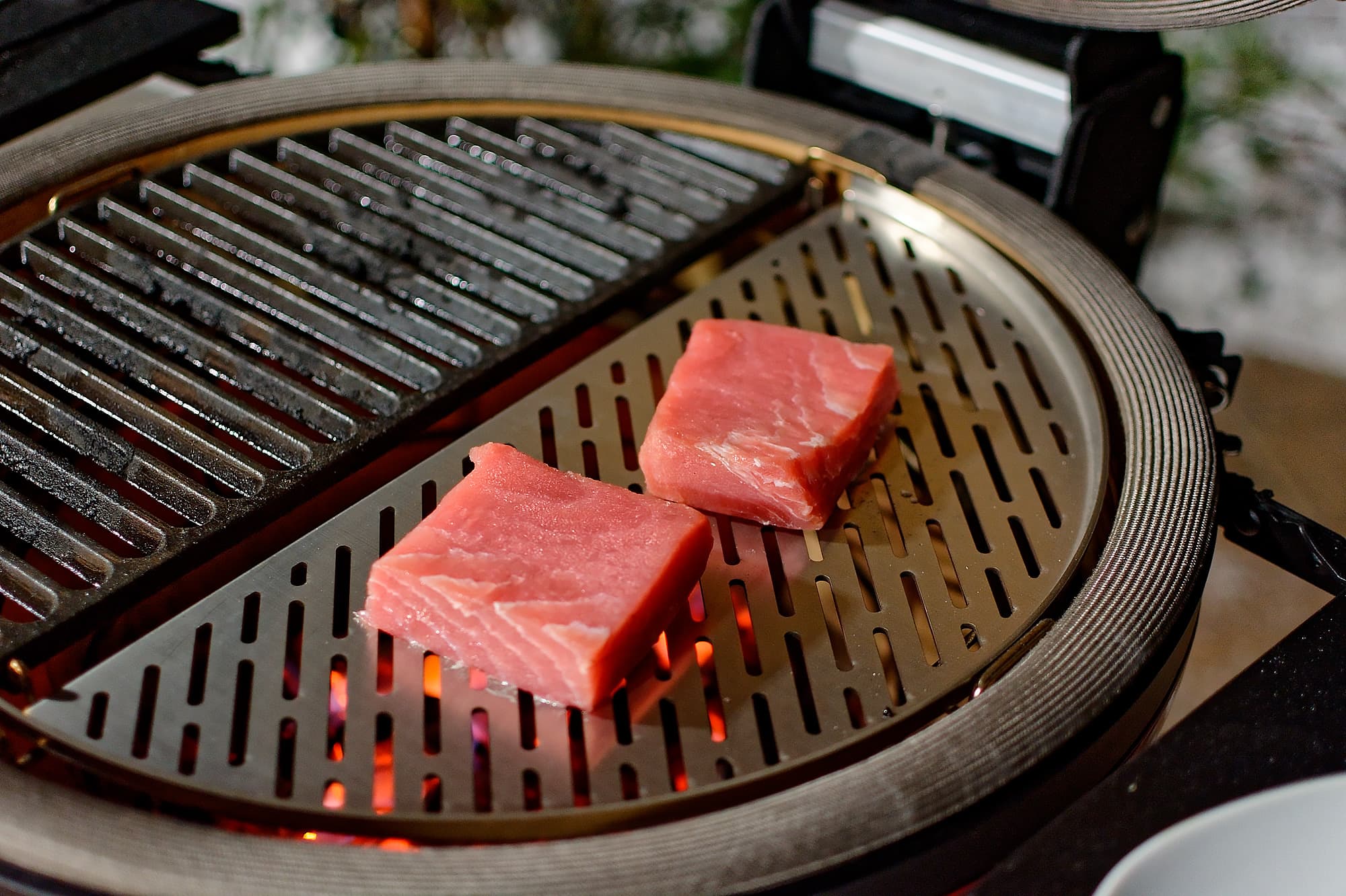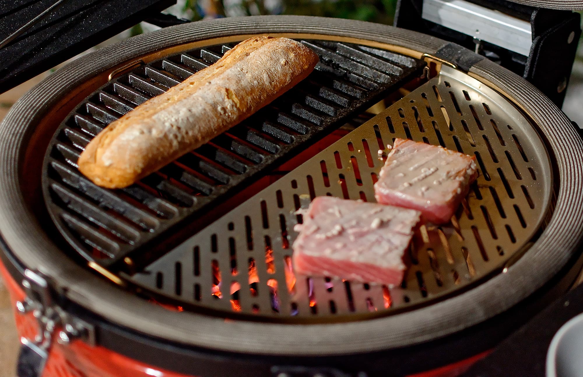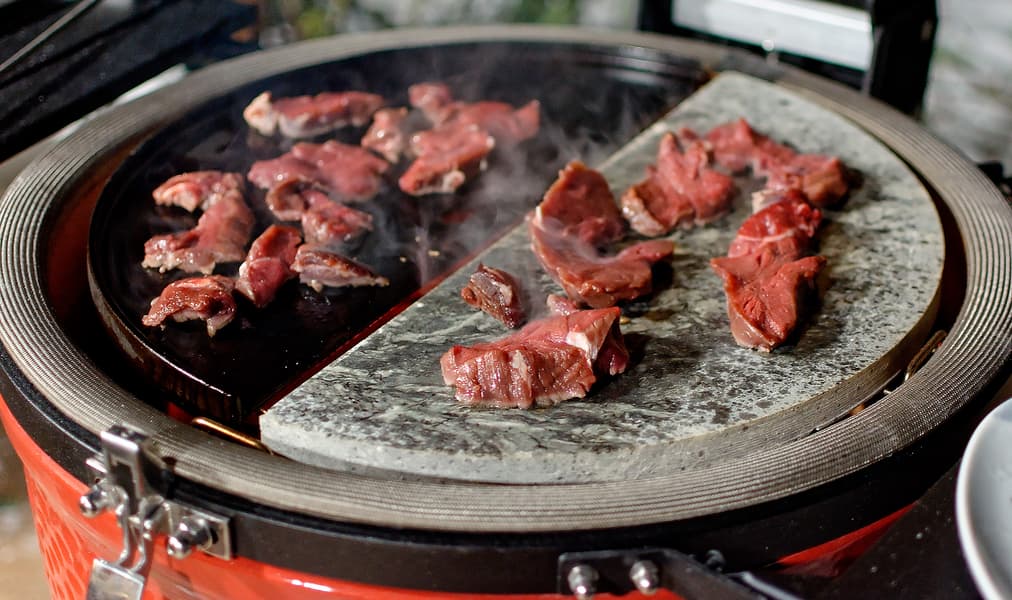 Мы готовили блюда как на прямом жаре, то есть над углями, так и с помощью жароотсекателя на средних и низких температурах, а также использовали гриль как духовку для выпечки — «погоняли» Kamado Joe Classic II, что называется, на славу. Поскольку нам предоставили дополнительные аксессуары (камень для жарки, решетка для рыбы, чугунные решетки и сковородки), мы, к немалому удовольствию дегустаторов, их все и задействовали.