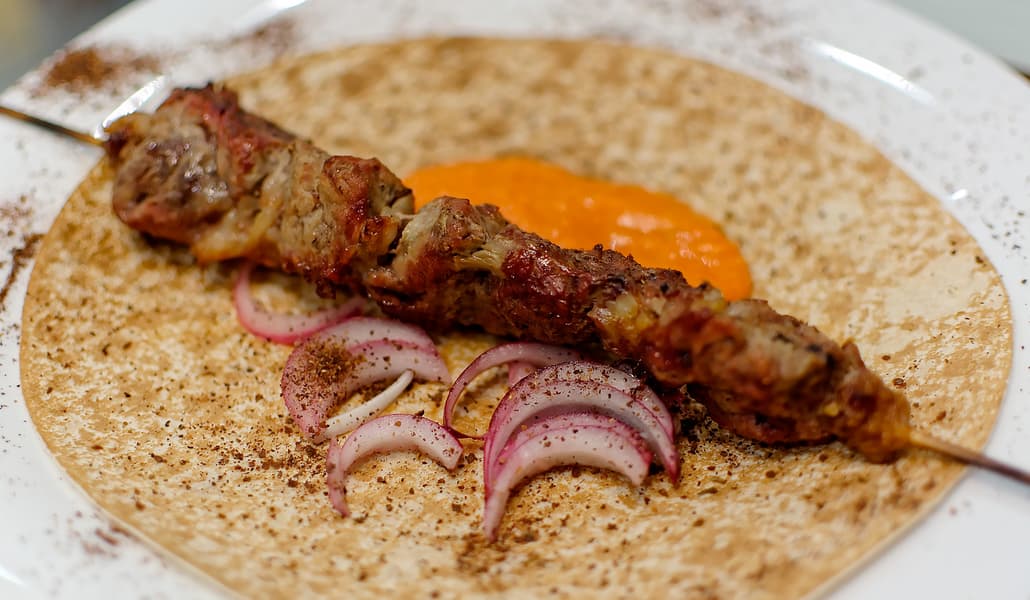 Подавали с тонким лавашом, лютеницей и красным луком, посыпая сумахом.