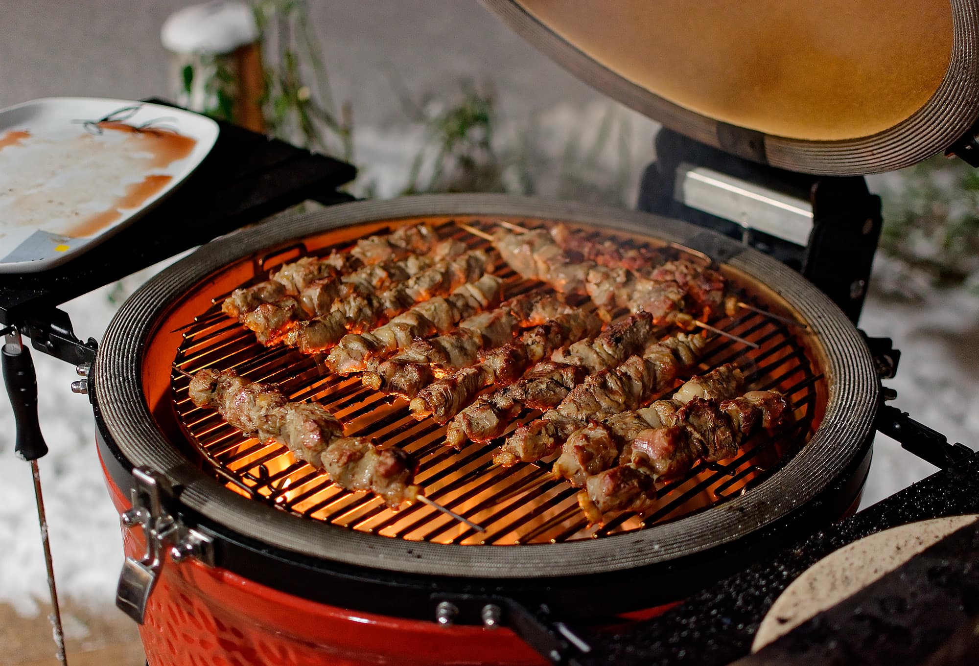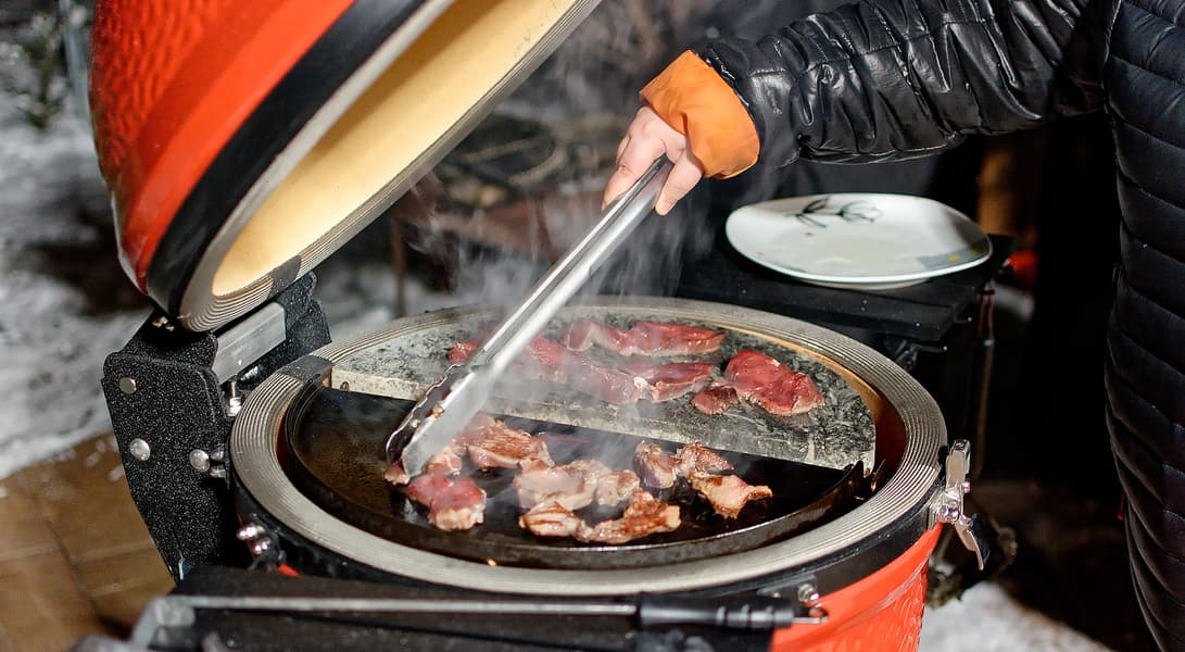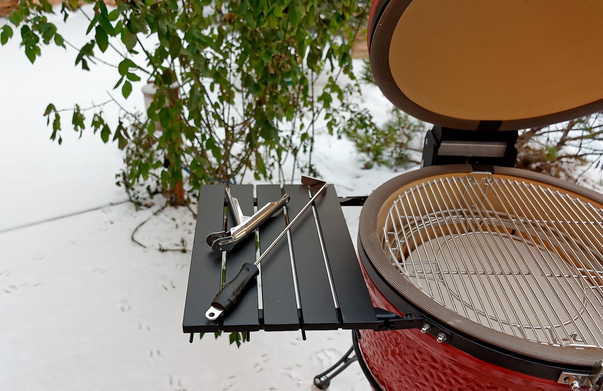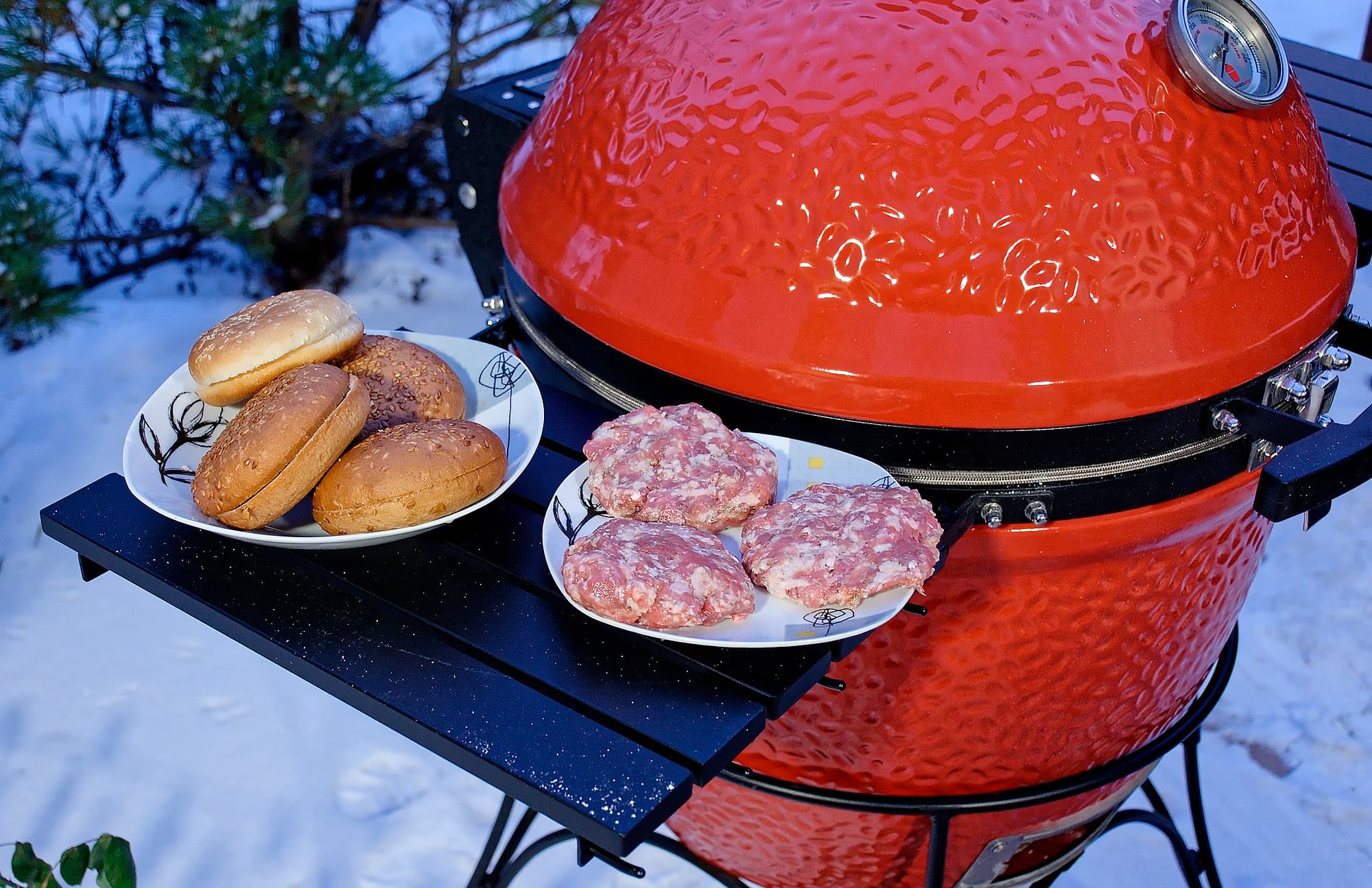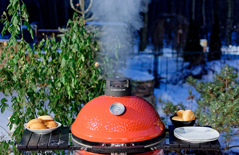 На дворе обнаружилась зима и достаточно солидный минус: что-то около 12 градусов. Мы еще с керамикой в такую погоду не работали и немного волновались: как гриль будет разгораться, долго ли прогреваться, хорошо ли держать тепло. Забегая вперед: существенных отличий от плюсовой температуры в поведении самого гриля не замечено, а вот повару приходится быть расторопнее, чтобы блюдо не остыло, пока несешь его с огня к столу.