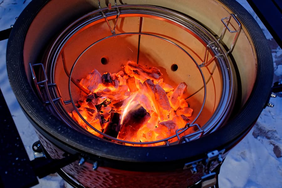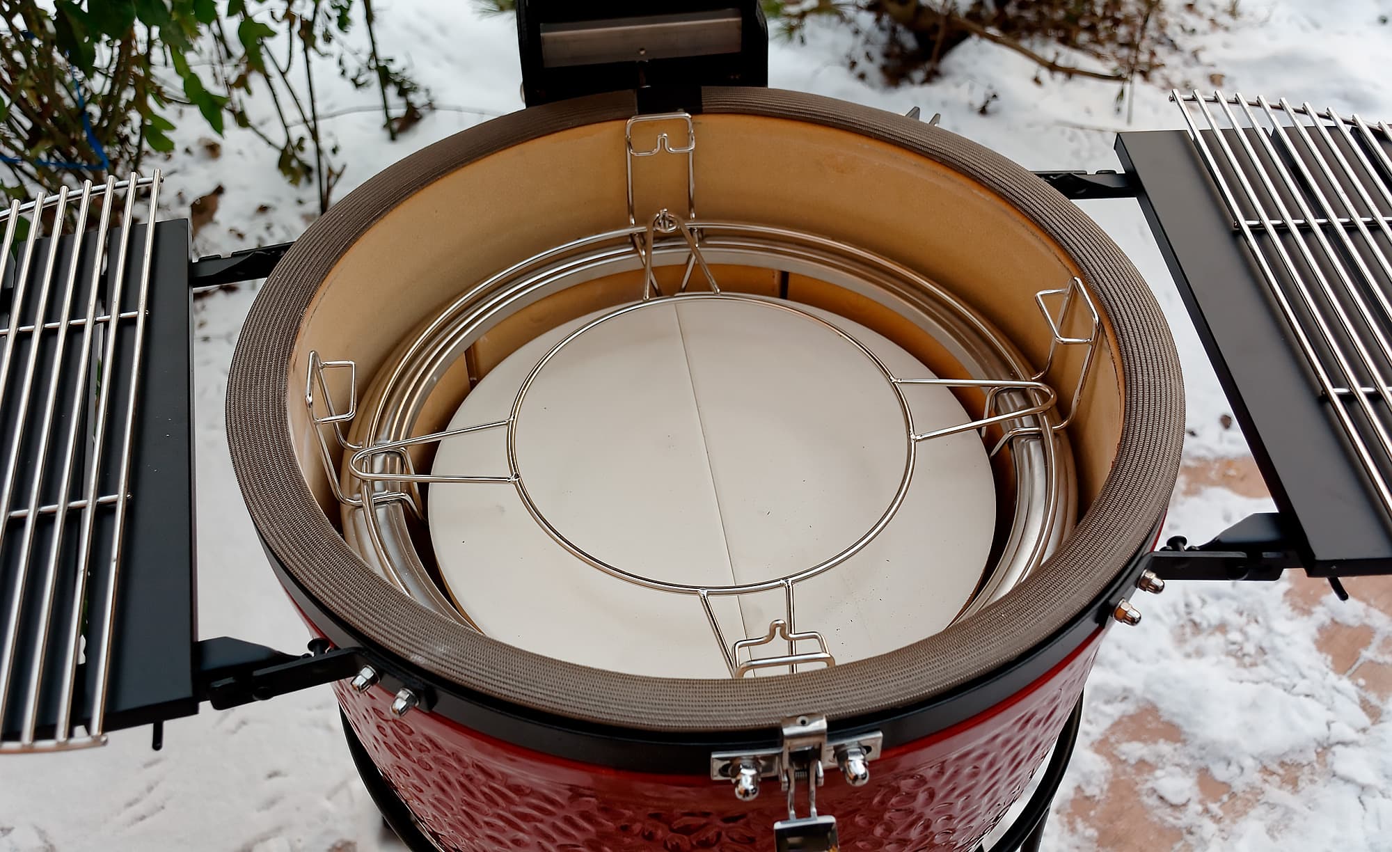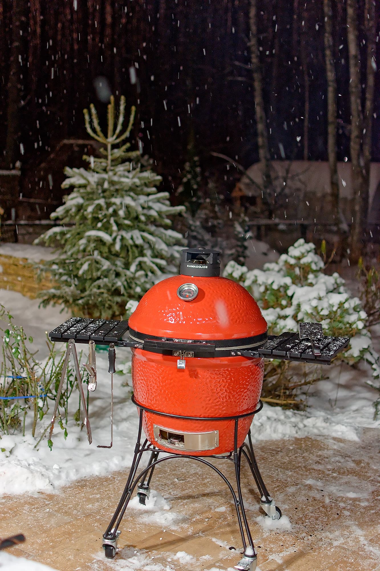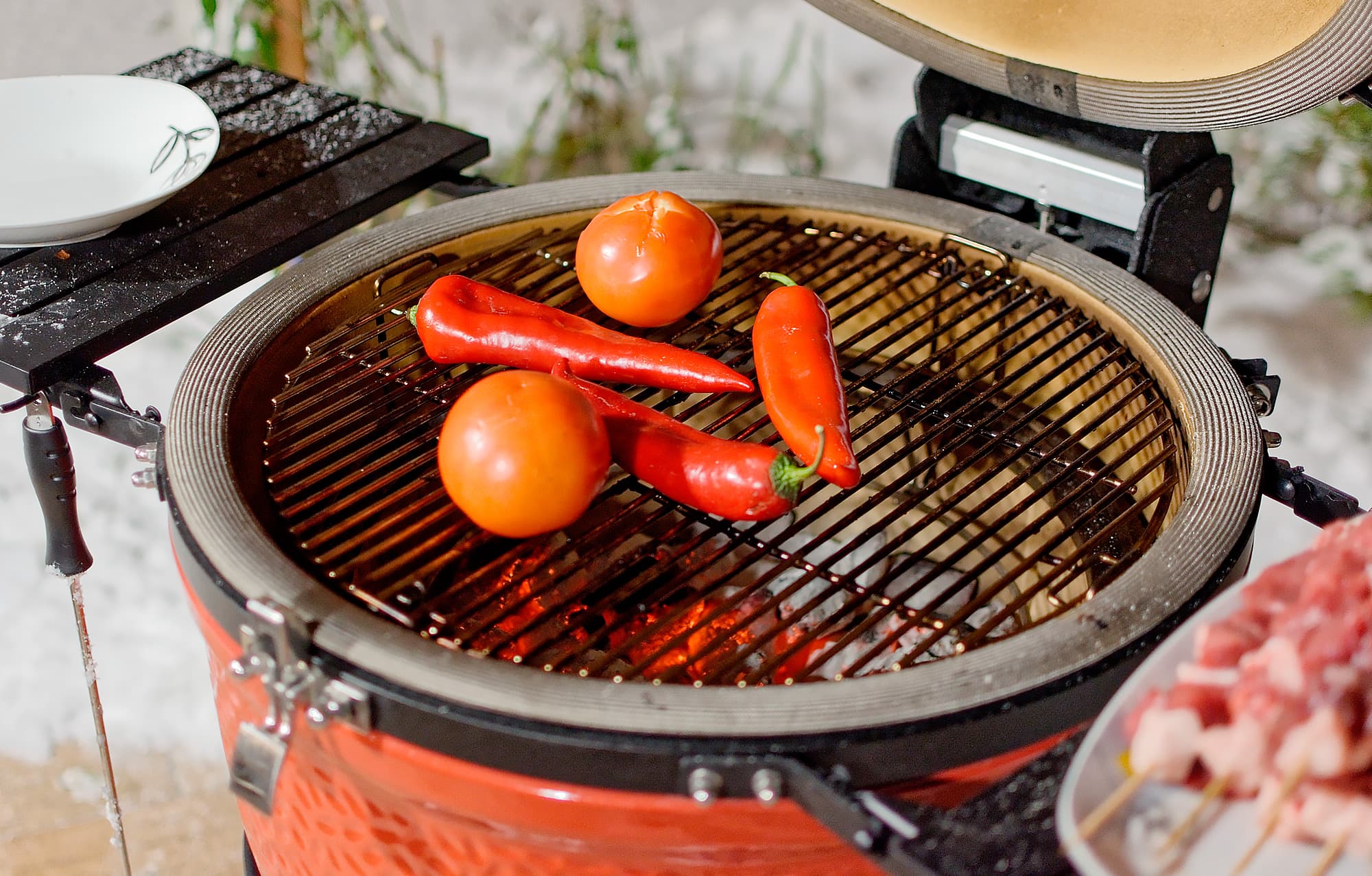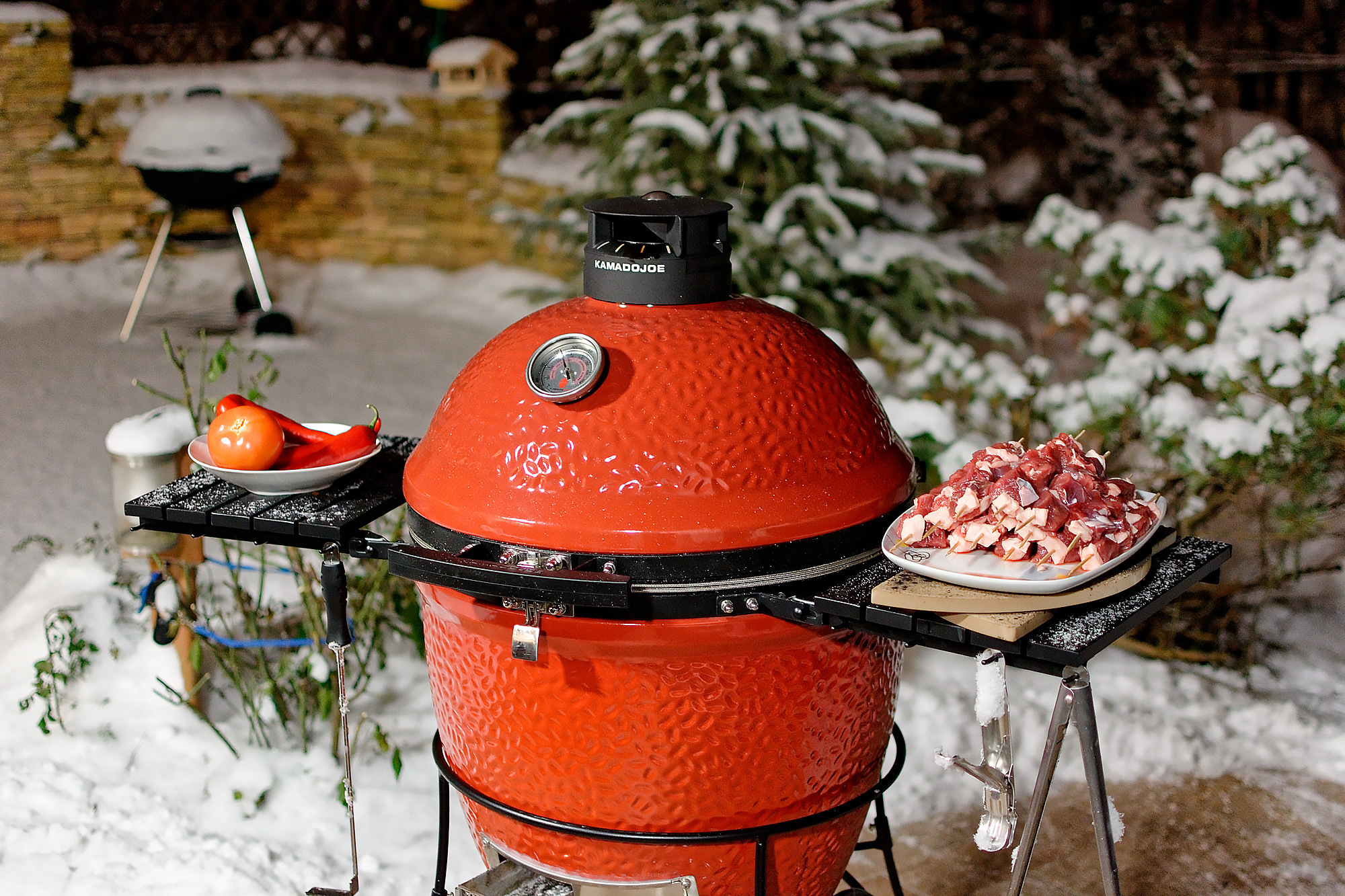 На дворе обнаружилась зима и достаточно солидный минус: что-то около 12 градусов. Мы еще с керамикой в такую погоду не работали и немного волновались: как гриль будет разгораться, долго ли прогреваться, хорошо ли держать тепло. Забегая вперед: существенных отличий от плюсовой температуры в поведении самого гриля не замечено, а вот повару приходится быть расторопнее, чтобы блюдо не остыло, пока несешь его с огня к столу.