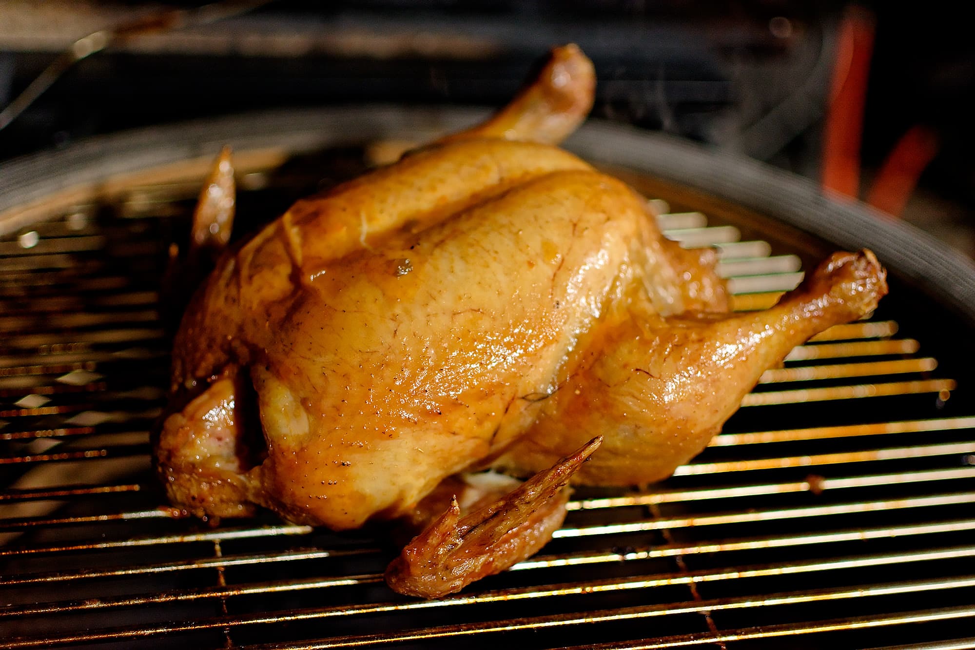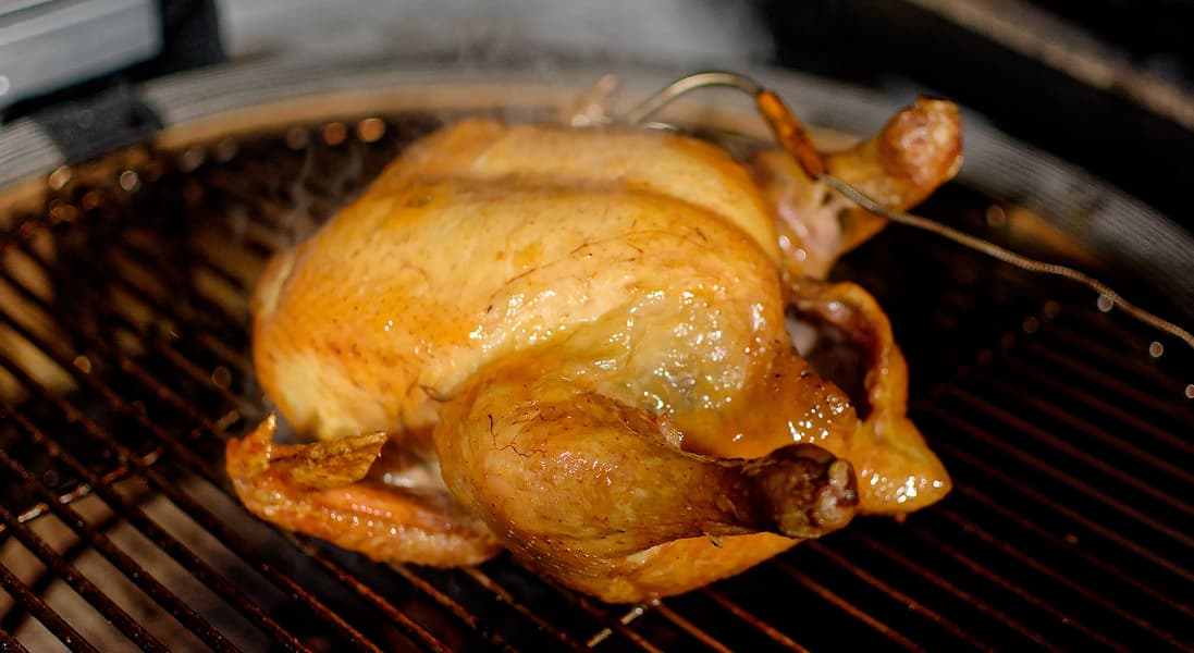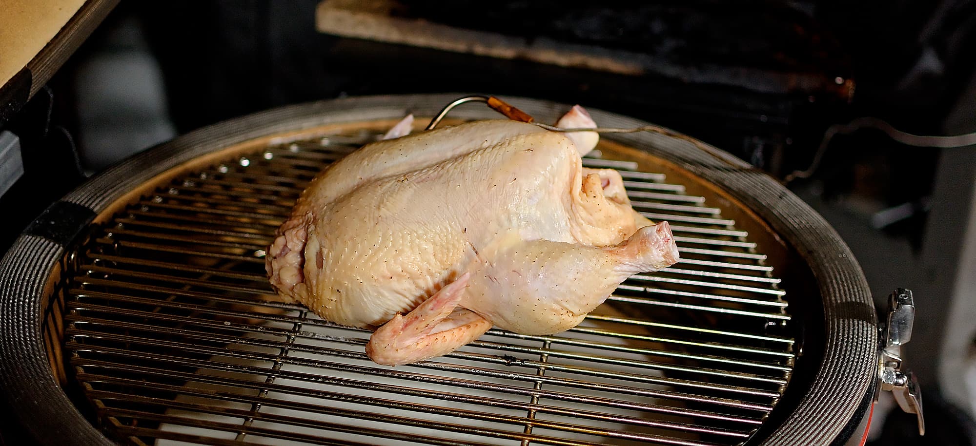 Дальше работаем с отсекателем, используя наш гриль в качестве гигантской керамической угольной духовки. Мы взяли крупную домашнюю курицу весом больше двух килограммов, натерли солью внутри и снаружи, воткнули в нее термометр, чтобы вовремя определить готовность, и закрыли крышку.
