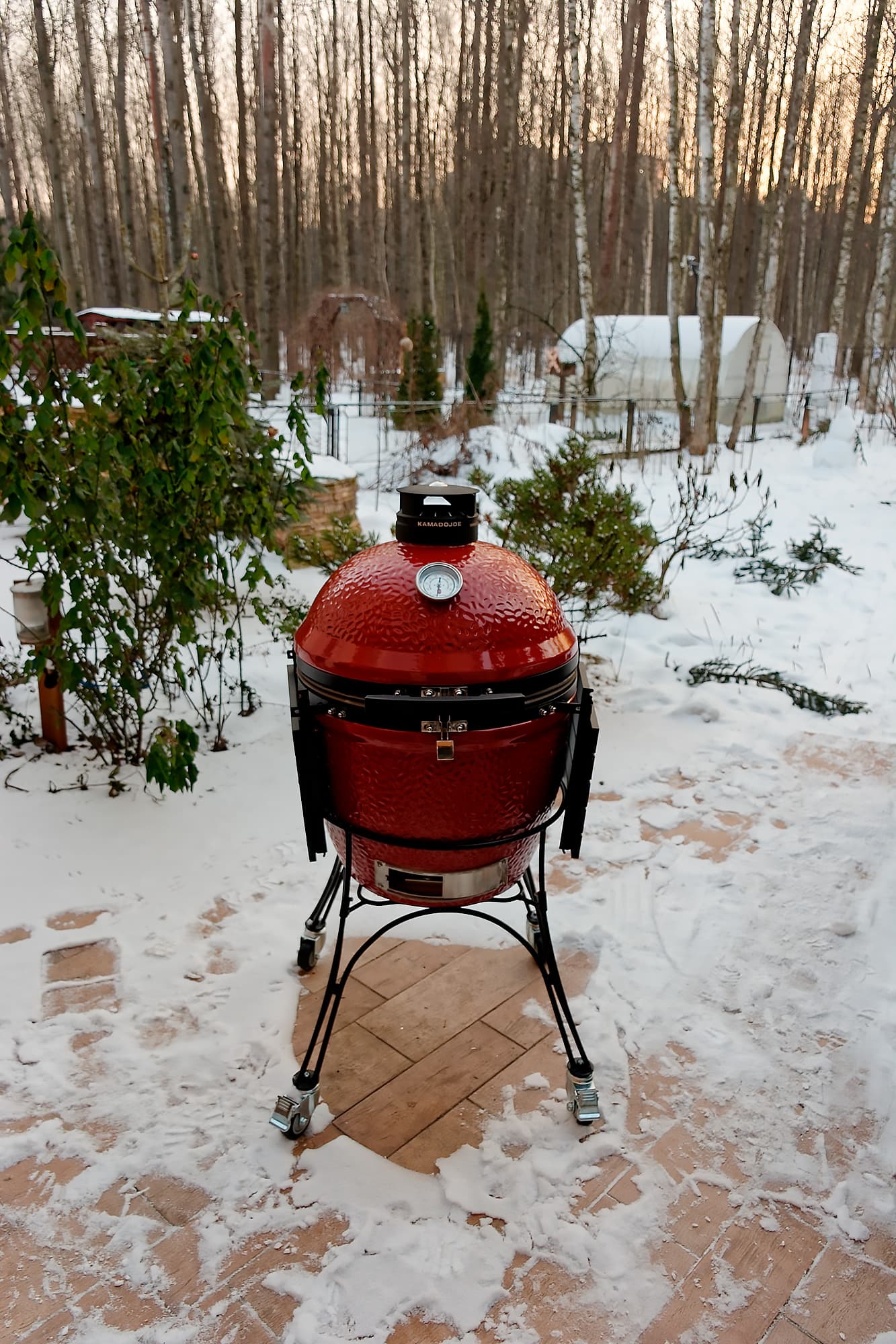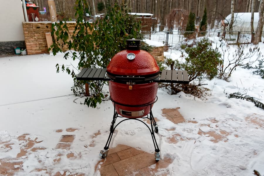 Керамические грили, ввиду их немалого веса и, скажем прямо, весьма высокой цены, обычно продают вместо с доставкой и сборкой. Мы от этой услуги тоже не отказались, тем более что на дворе стоял устойчивый минус (около −10 °C), поэтому тестирование и так предстояло «экстремальное».