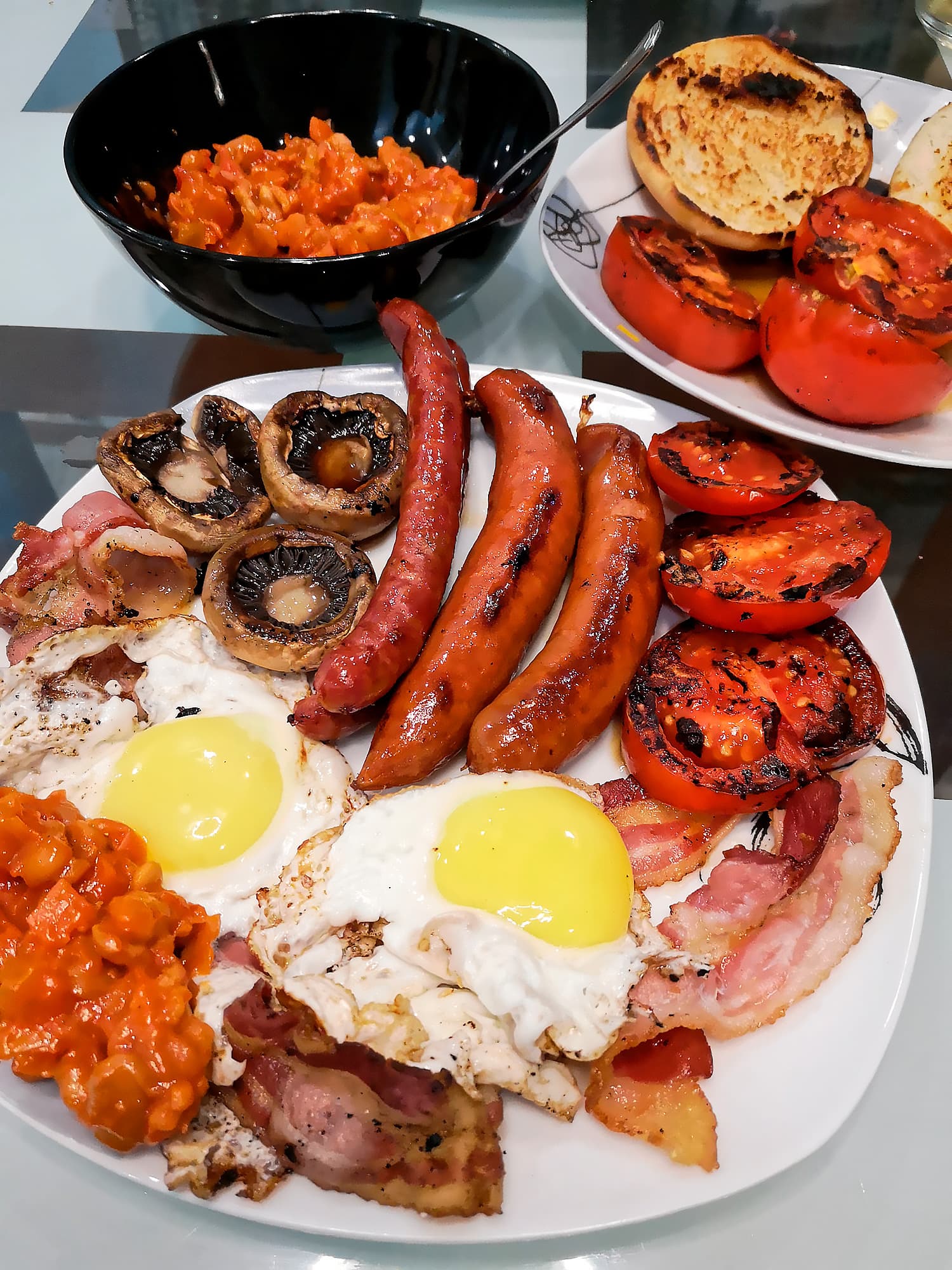 В английский завтрак чаще всего входят бекон, колбаски, яйца, жареные томаты, жареный хлеб, а в нашем случае еще и шампиньоны-гриль.