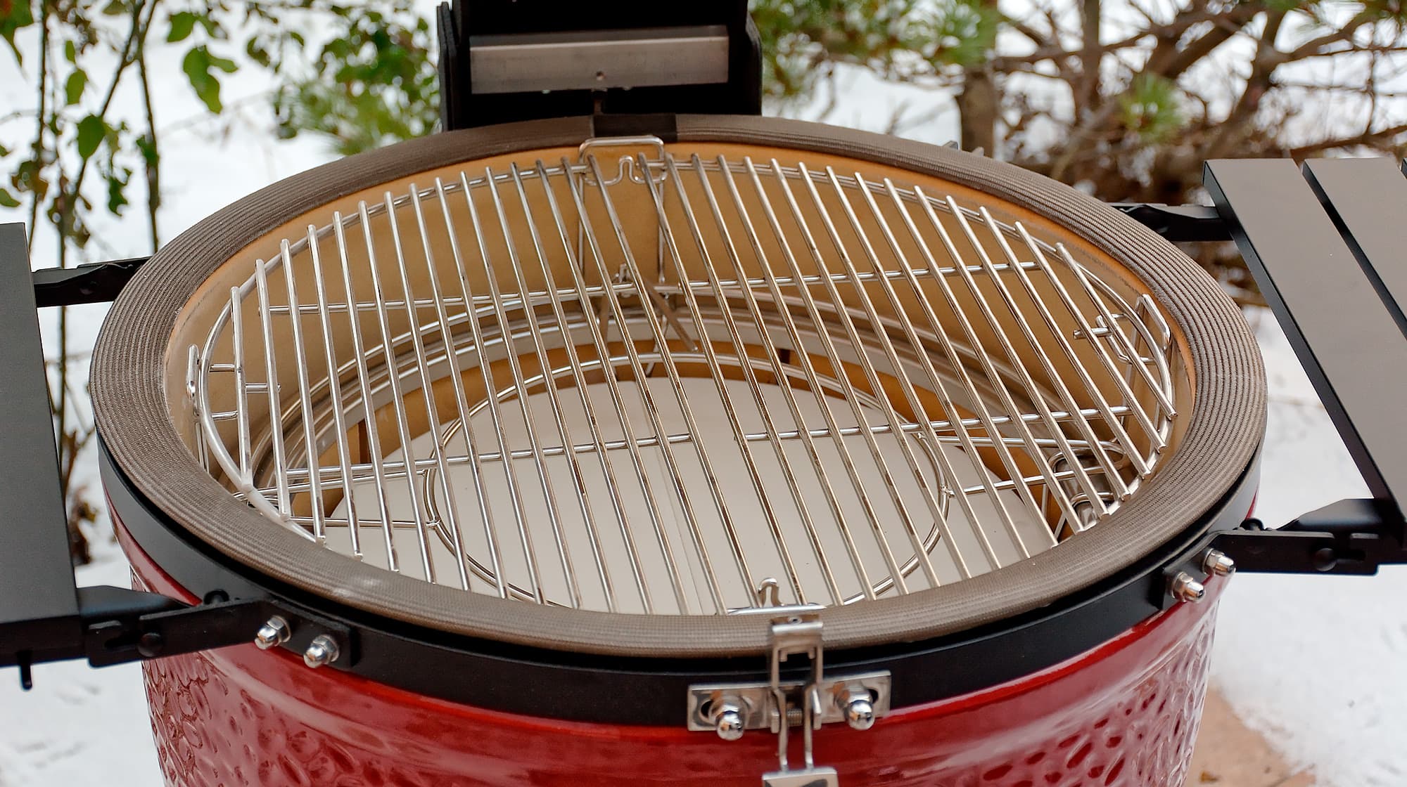 - Комплектная ручка для держания решетки, несмотря на хлипкий внешний вид, является наилучшим и самым удобным инструментом для снятия решетки с гриля и установки ее на гриль. А лежащий повсюду снег является идеальным способом эту самую решетку быстро охладить (только не применяйте этот способ к камню или керамическому жароотсекателю — могут расколоться!).