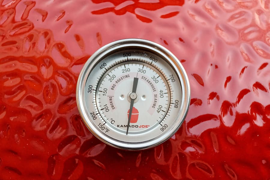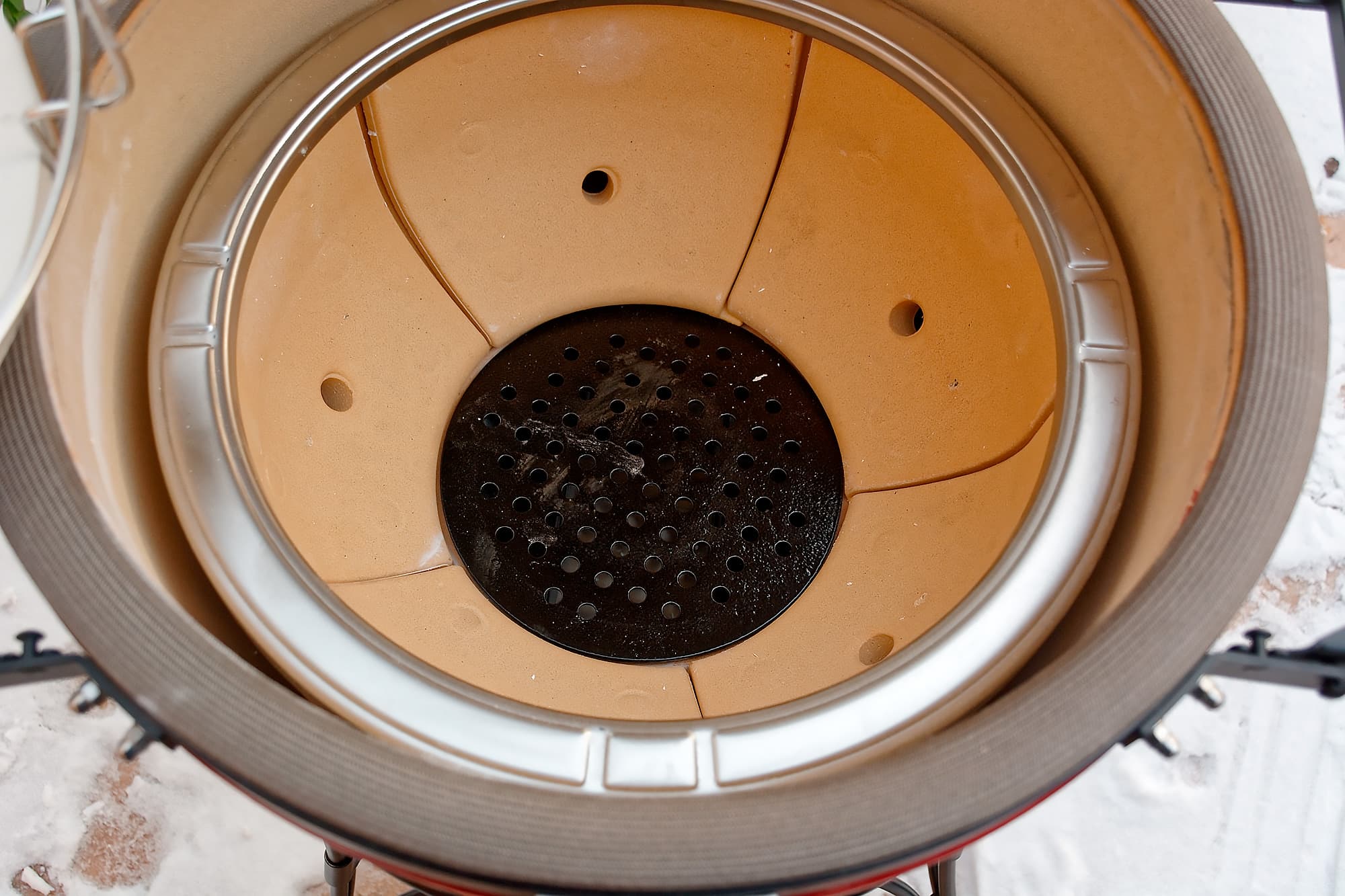 Внутренний термометр показывает, что тепло быстро улетучивается при каждом открытии крышки, но затем так же быстро и набирается: угли жаркие, тяга в мороз хорошая, керамика толстая.