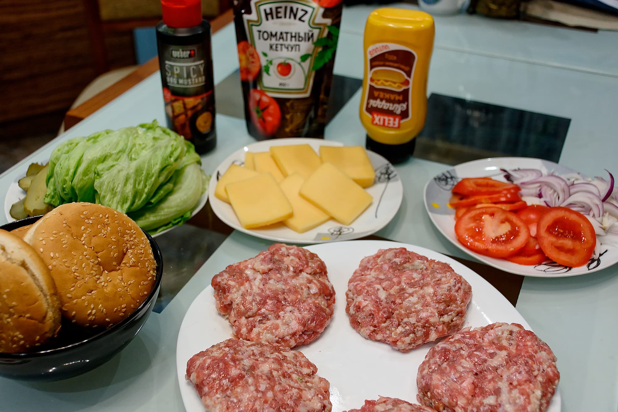 Пока разгорались угли и прогревался гриль, мы по-рабоче-крестьянски налепили руками котлет для бургеров, нарубили сыра, подготовили овощи и соусы.