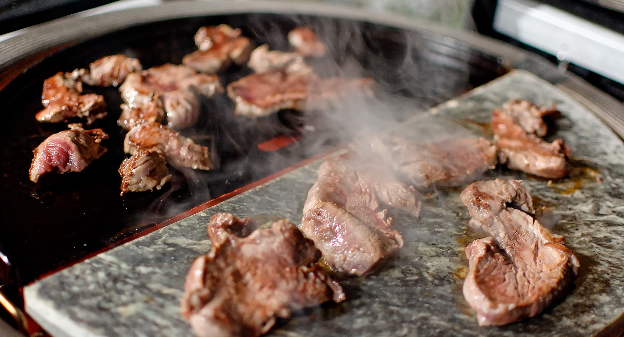 Используем плоскую сторону чугунной сковороды, а также камень для жарки. Обжариваем небольшие кусочки говяжьей вырезки, немного подсоленные.