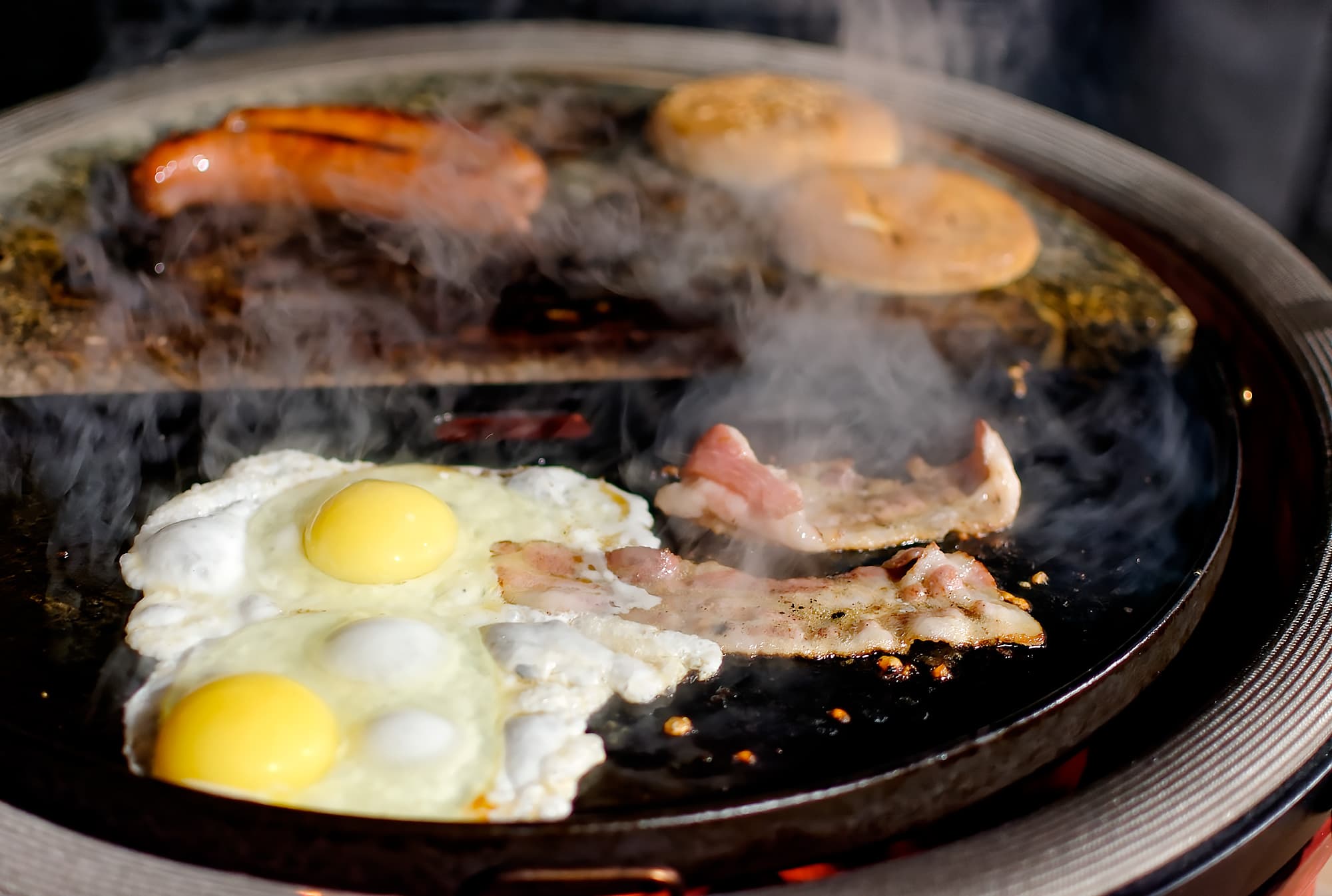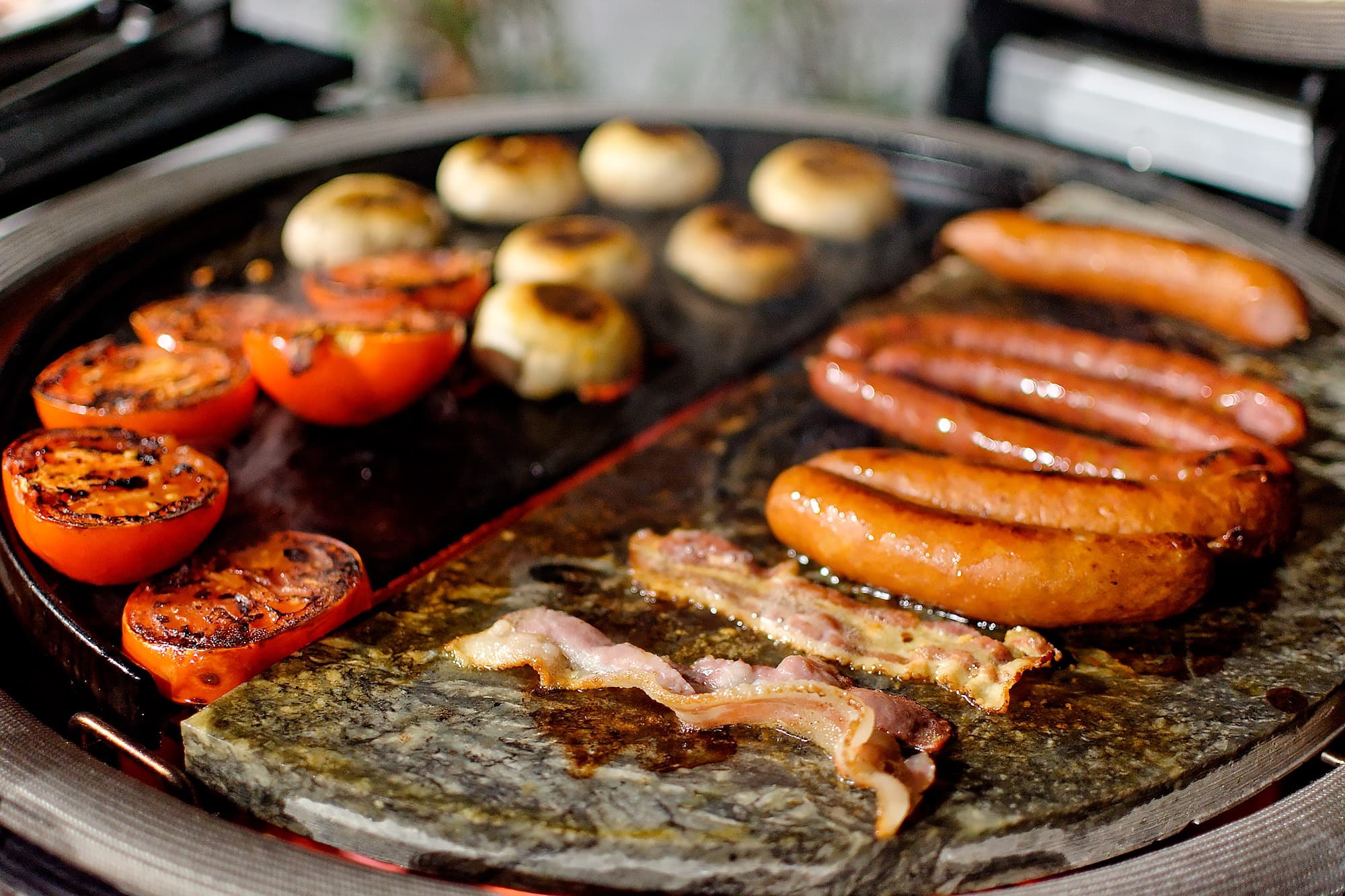 Здесь мы используем и чугунную поверхность, и камень. Обжаривать будем множество продуктов, которые в сумме составят одну из версий традиционного английского завтрака. В отличие от европейского, континентального завтрака «ни о чем», это завтрак сытный и вкусный (если это домашний, а не отельный вариант, конечно).