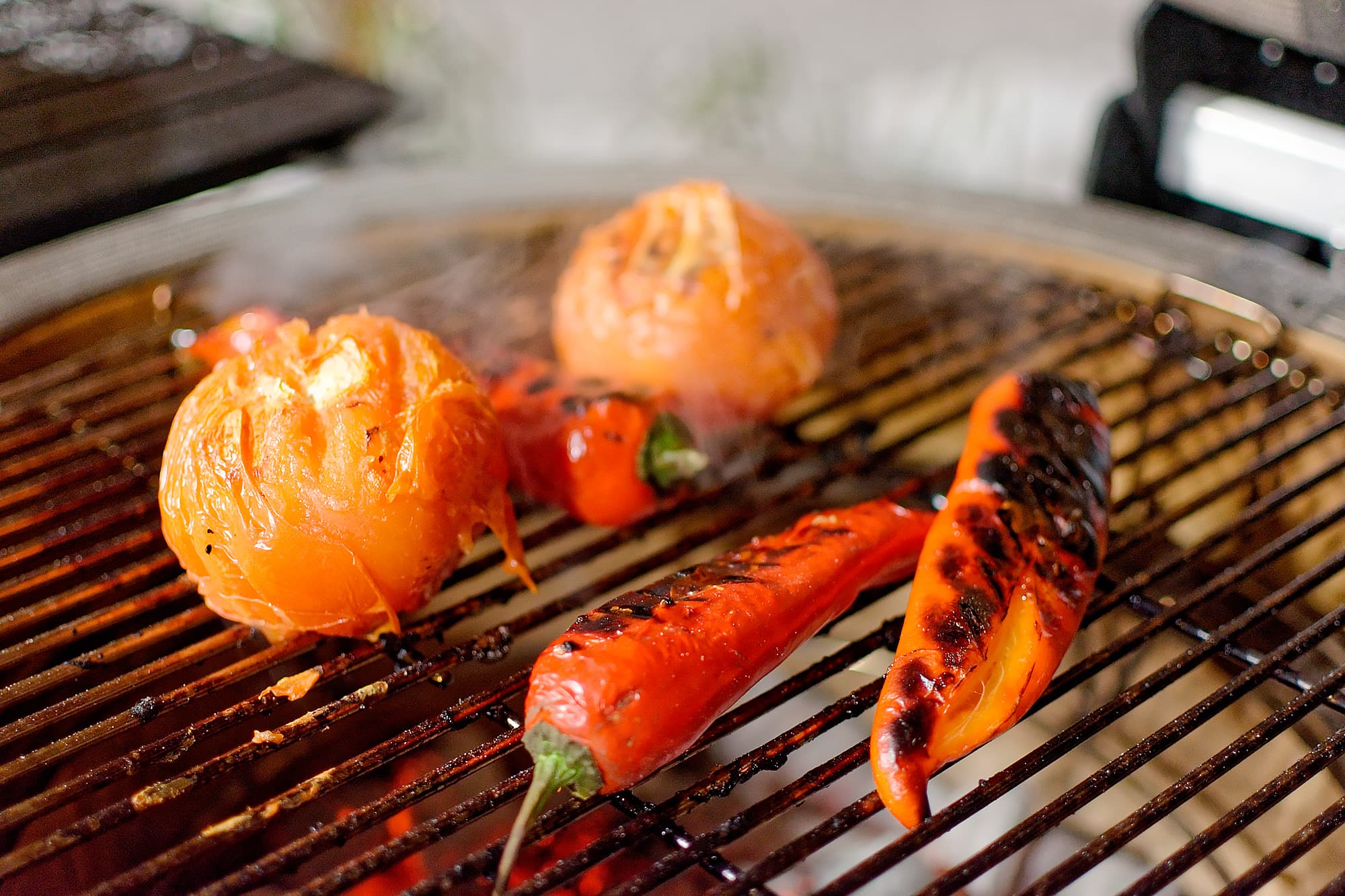 Помидоры и перцы мы положили на решетку гриля и накрыли крышкой. Овощи у нас, конечно, зимние — ну дак и на дворе зима. Посмотрим, получится ли с помощью гриля придать жизни немного летнего аромата.