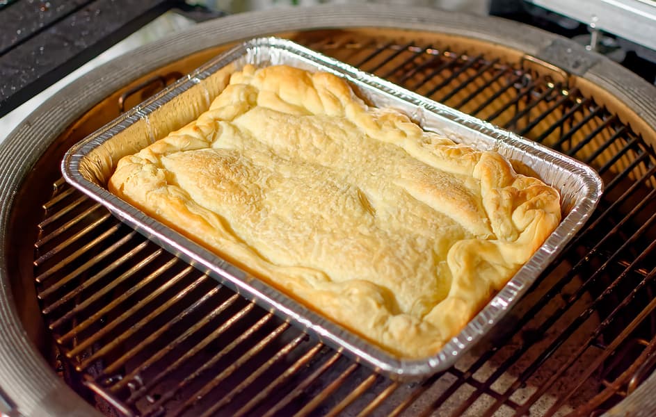 Получилось сверхаппетитное блюдо, пирог из гриля вообще встретишь нечасто, а в сочетании угольный дух и нежный аромат сыра с чесноком, кажется, всю округу не оставили равнодушной.