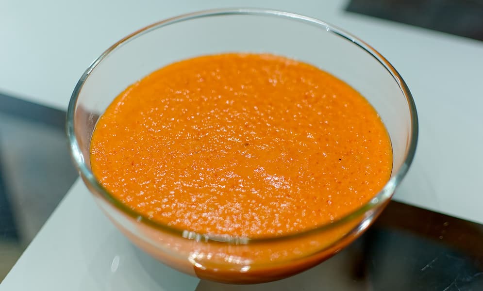 Запекать постарались так, чтобы со всех боков почернела наружная кожица, затем сложили овощи в большую миску и накрыли крышкой. Через 20 минут вся шкурка «отстала» от мякоти, и мы, обжигаясь, сняли мякоть с овощей, поместили в блендер, добавили чеснока, соли, сушеного острого перца и капельку оливкового масла.