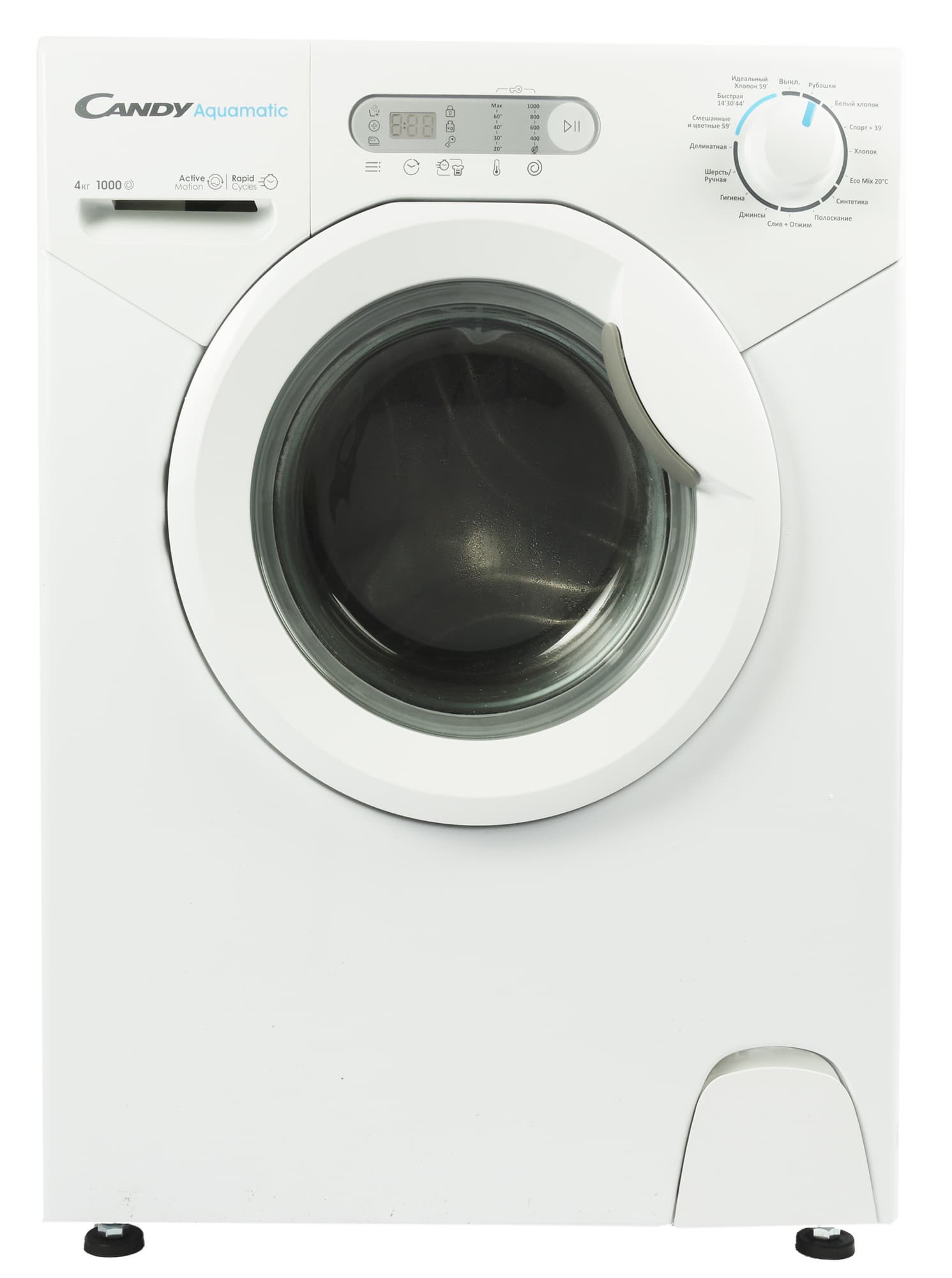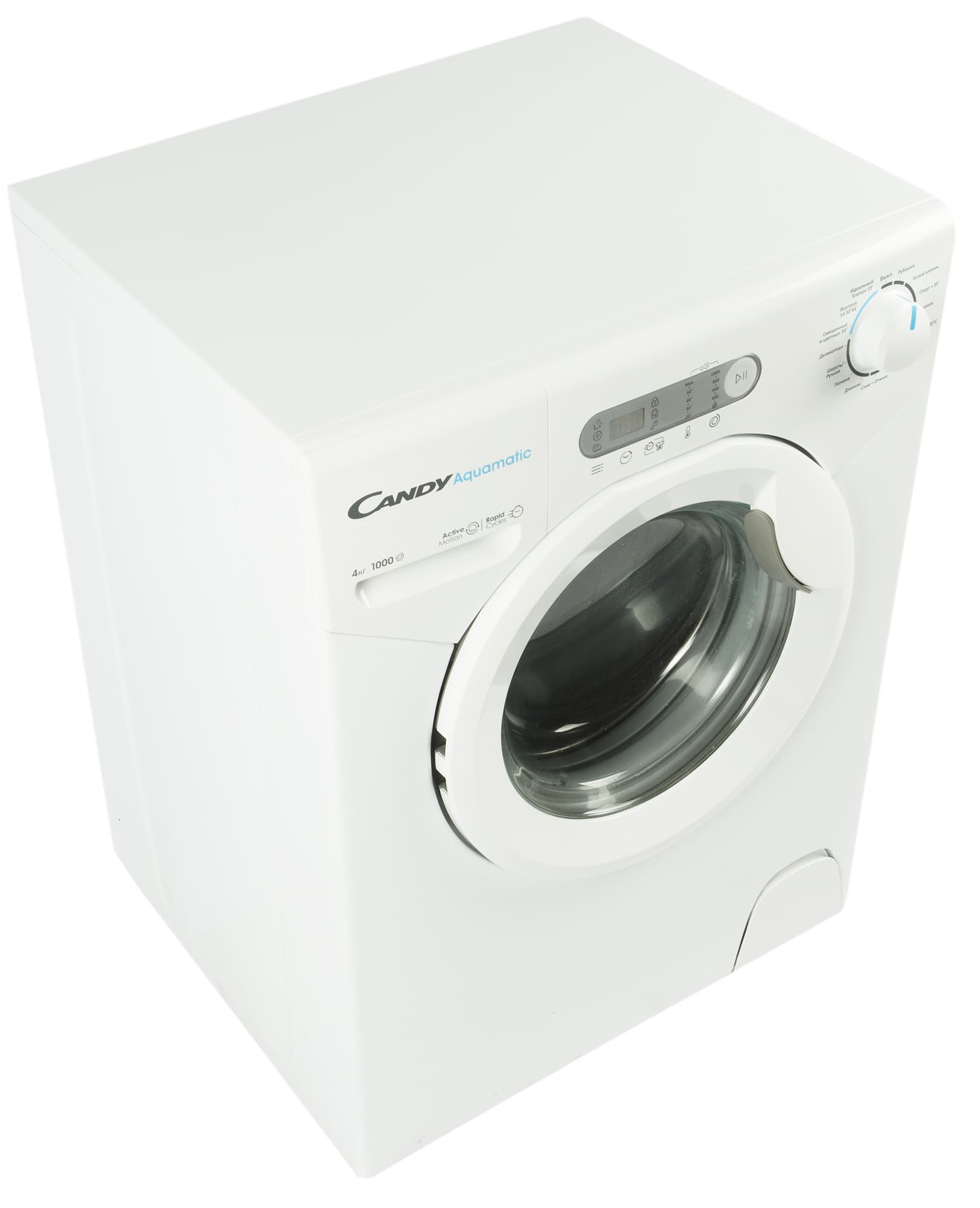 В дополнение к стандартным программам для стирки хлопка, смешанных, деликатных тканей и шерсти у этой модели, как и большинство стиральных машин Candy, есть три фирменных режима для быстрой стирки — на 14, 30 и 59 минут. В нашей модели они расположены на одном положении селектора, а точное время быстрой стирки нужно будет выбрать нажатием на соответствующую кнопку.