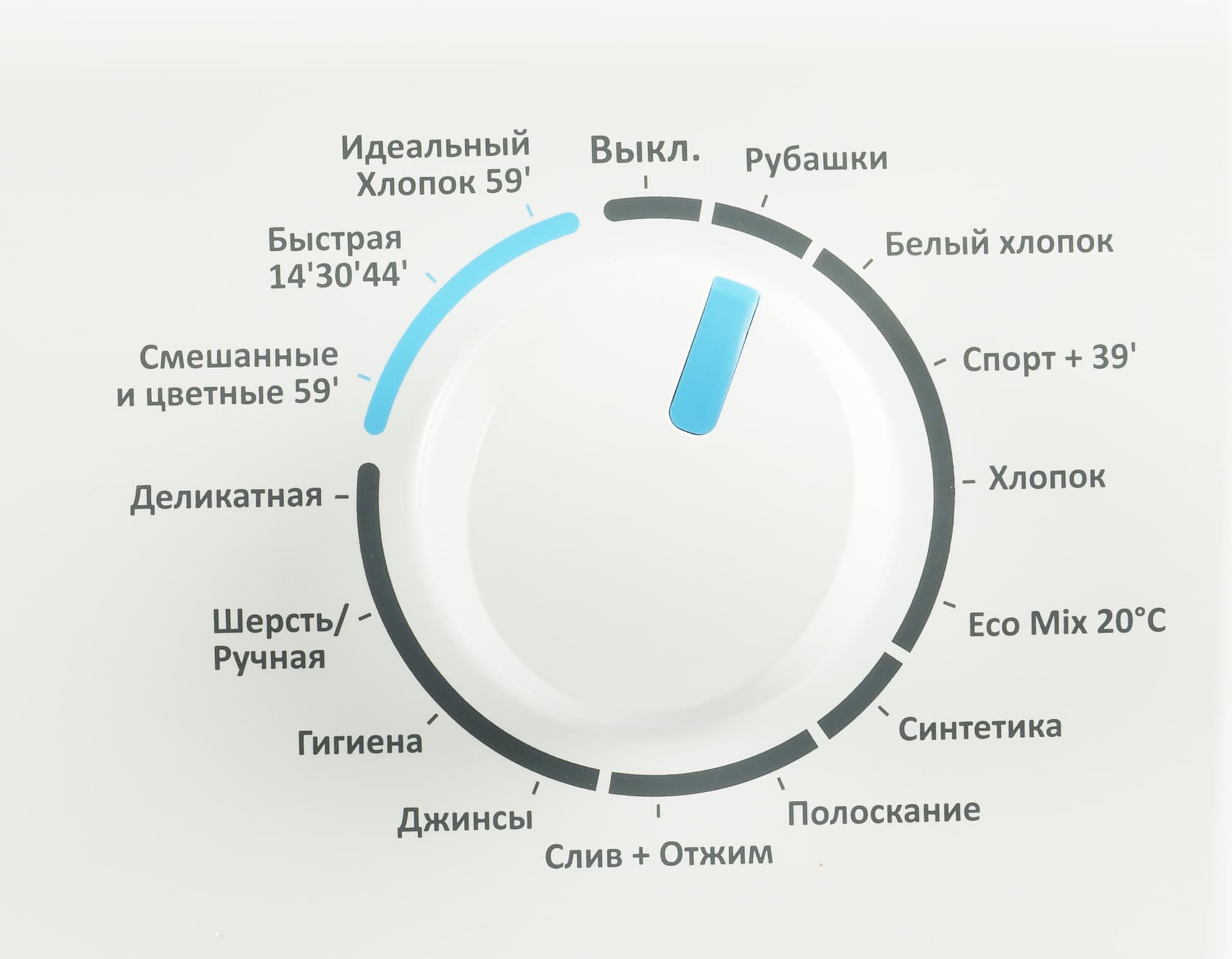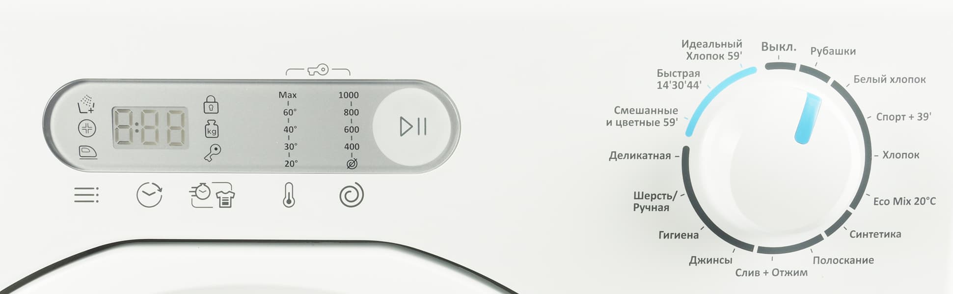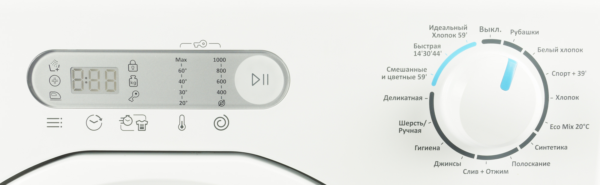 Время ряда программ заявлено как 0:59. То есть для многих жизненных сценариев можно рассчитывать, что стирка займет час. Довольно удобно — не придется каждый раз вспоминать, сколько там стираются джинсы и подсчитывать, успеет ли машинка достирать до момента, когда придет пора выходить из дома.