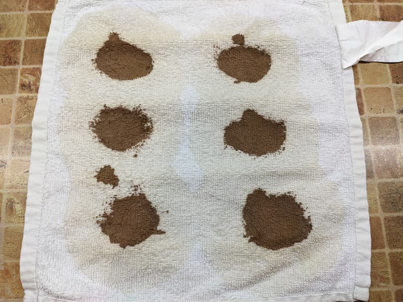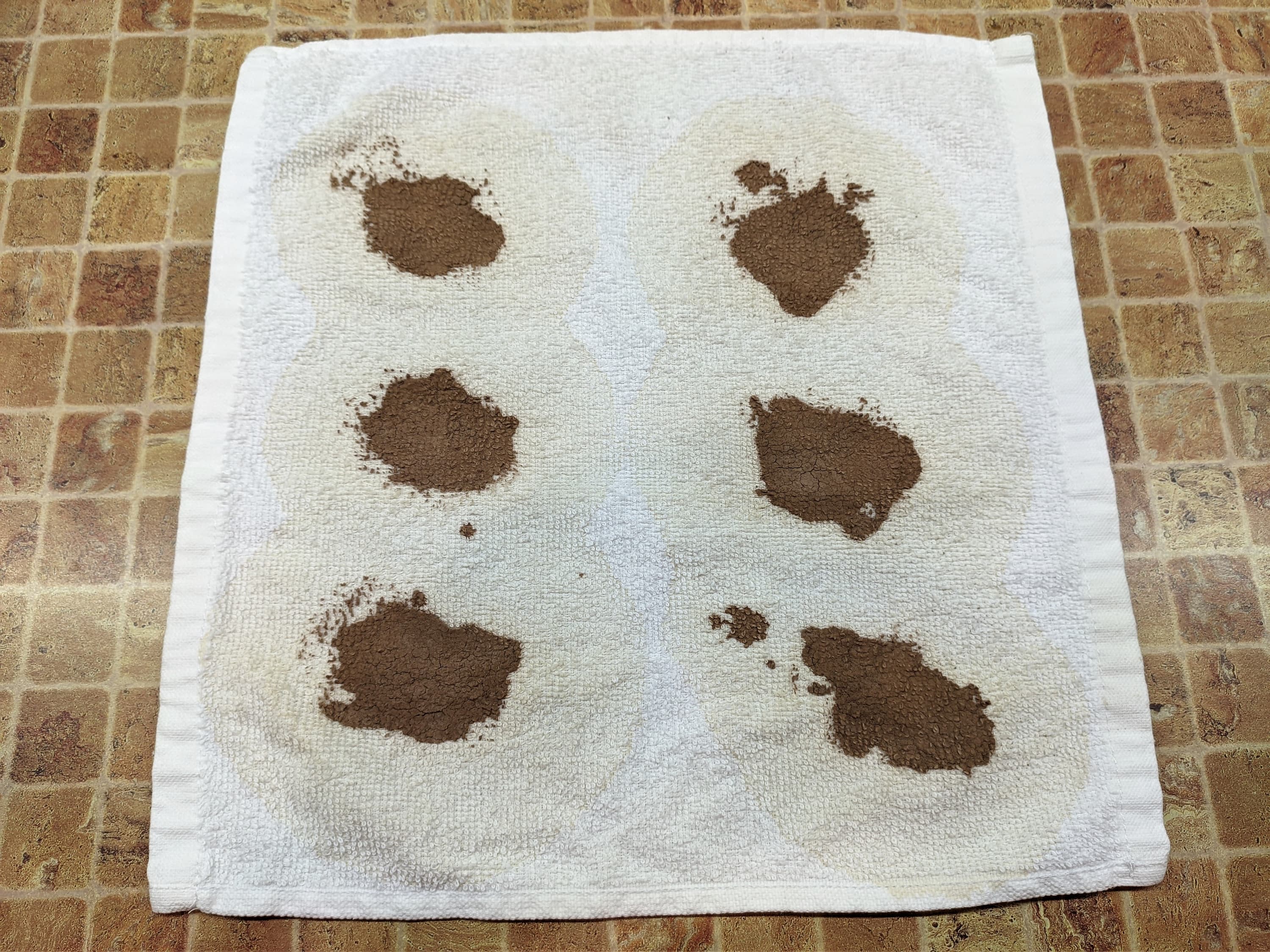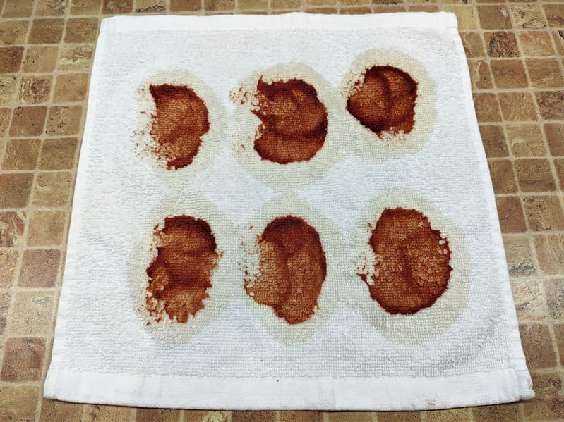 На комплект из белых хлопковых полотенец мы загрязнили красным вином, соевым соусом, кетчупом и какао (на каждом полотенце свое вещество). Загрязнения высушили при комнатной температуре в течение суток, после чего загрузили тестовую стирку.