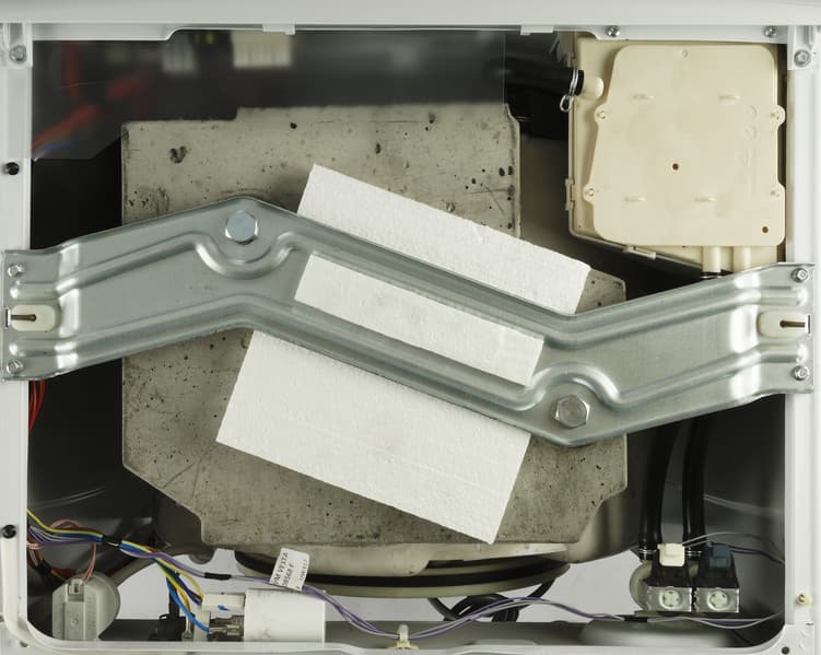 После этого, наклонив машину, нужно вытянуть из-под днища две пенопластовых прокладки, фиксирующие барабан.