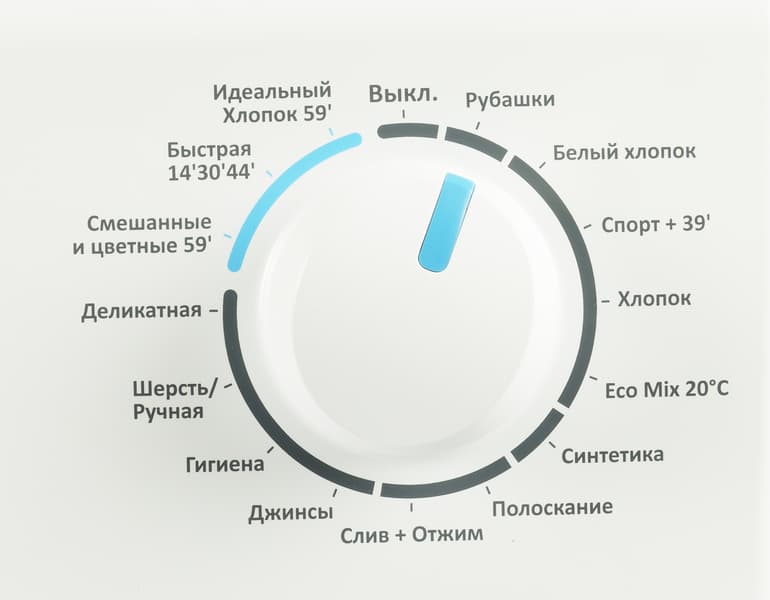 Селектор программ позволяет выбрать нужный сценарий для соответствующего типа ткани. Для некоторых (например, хлопка) предусмотрено несколько программ. Жаль, что рядом с ними не указана температура, при которой будет производиться стирка. Придется заглядывать в таблицу программ.