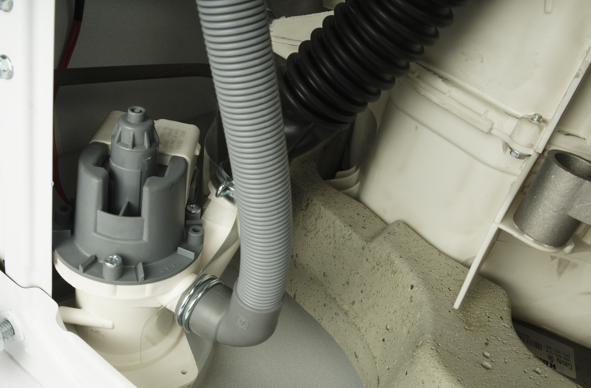 Задняя стенка также имеет выштамповку. В верхней части крышки находится штуцер для подключения заливного шланга, он снабжен съемным сетчатым фильтром, который защищает машину от ржавчины и загрязнений, если они вдруг появятся в водопроводной воде (такое обычно случается при отключении воды и ее повторной подаче — из труб вылетают отложения, которые легко засоряют фильтры в машинках и на смесителях). Снизу, на задней стенке, выходит несъемный гофрированный сливной шланг традиционной конструкции. Транспортировочных болтов в данной модели мы не обнаружили.