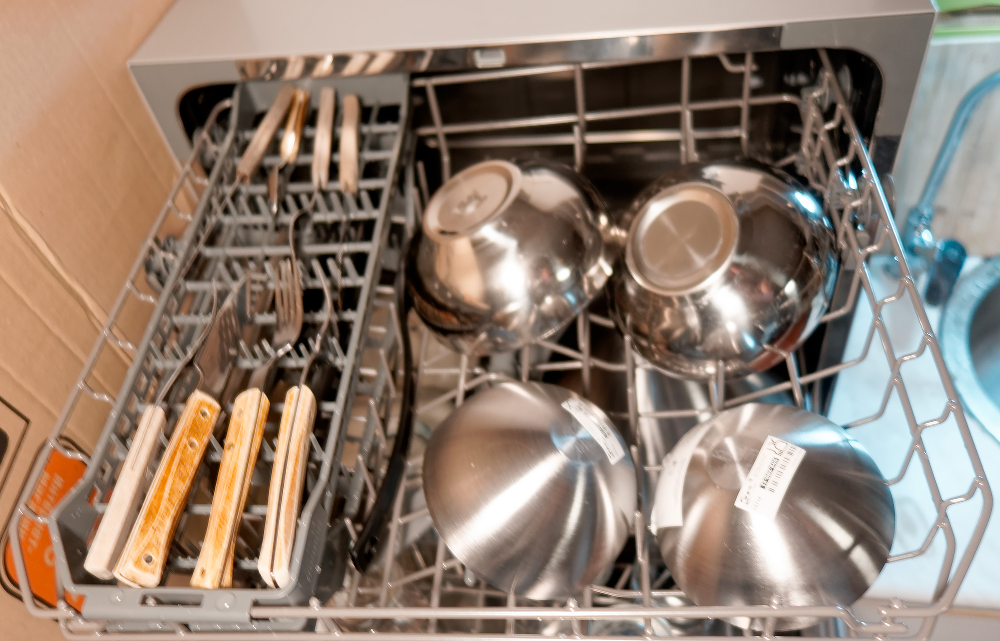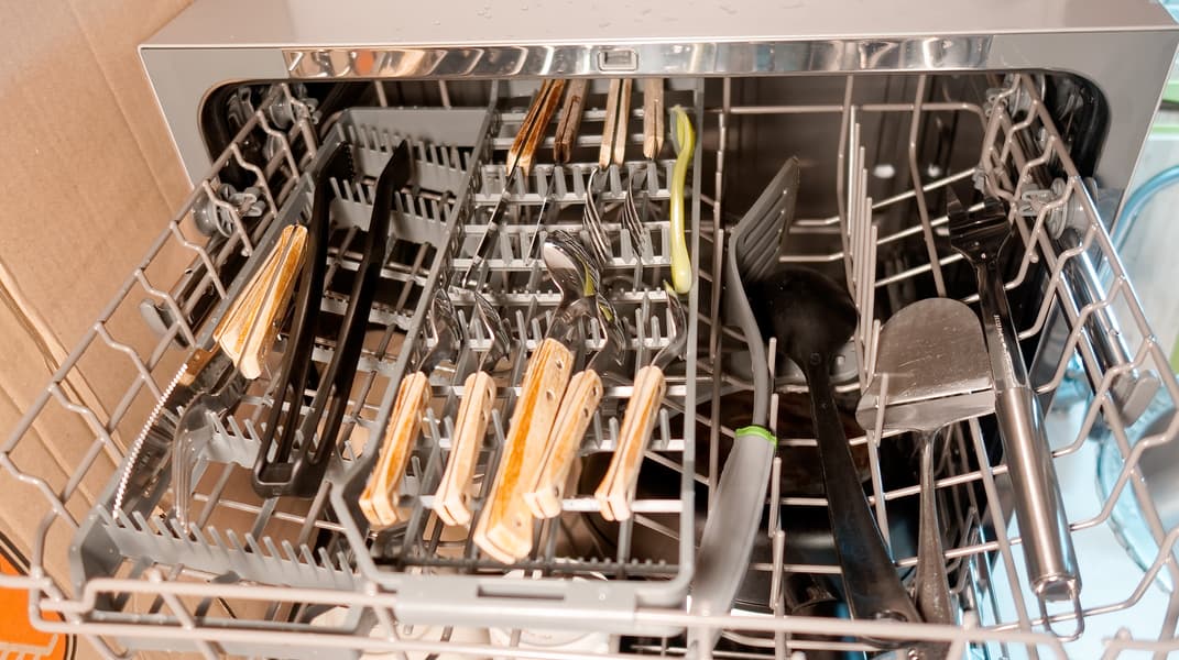 При необходимости помыть большую кастрюлю, мы уже сталкиваемся с дефицитом места. Впрочем, это обычное дело с небольшой настольной посудомойкой, судя по нашему опыту. В таком случае кастрюлю моем с остальными приборами для готовки и парой стаканов, а вторым циклом загружаем сервировочную посуду. Рачительный хозяин внутри тестировщика в этот момент немного возмущается, но опыт подсказывает, что чем меньше в машину напихано предметов, особенно крупных и жирных, — тем лучше все отмоется.