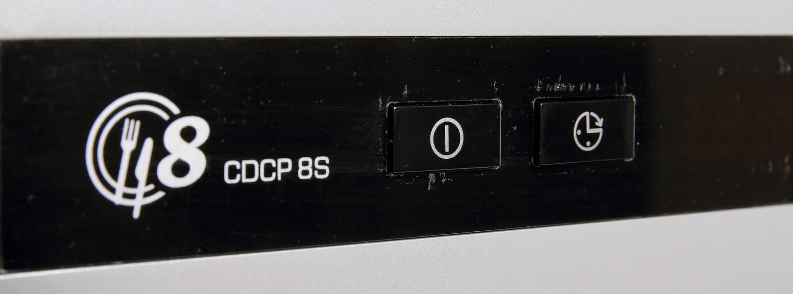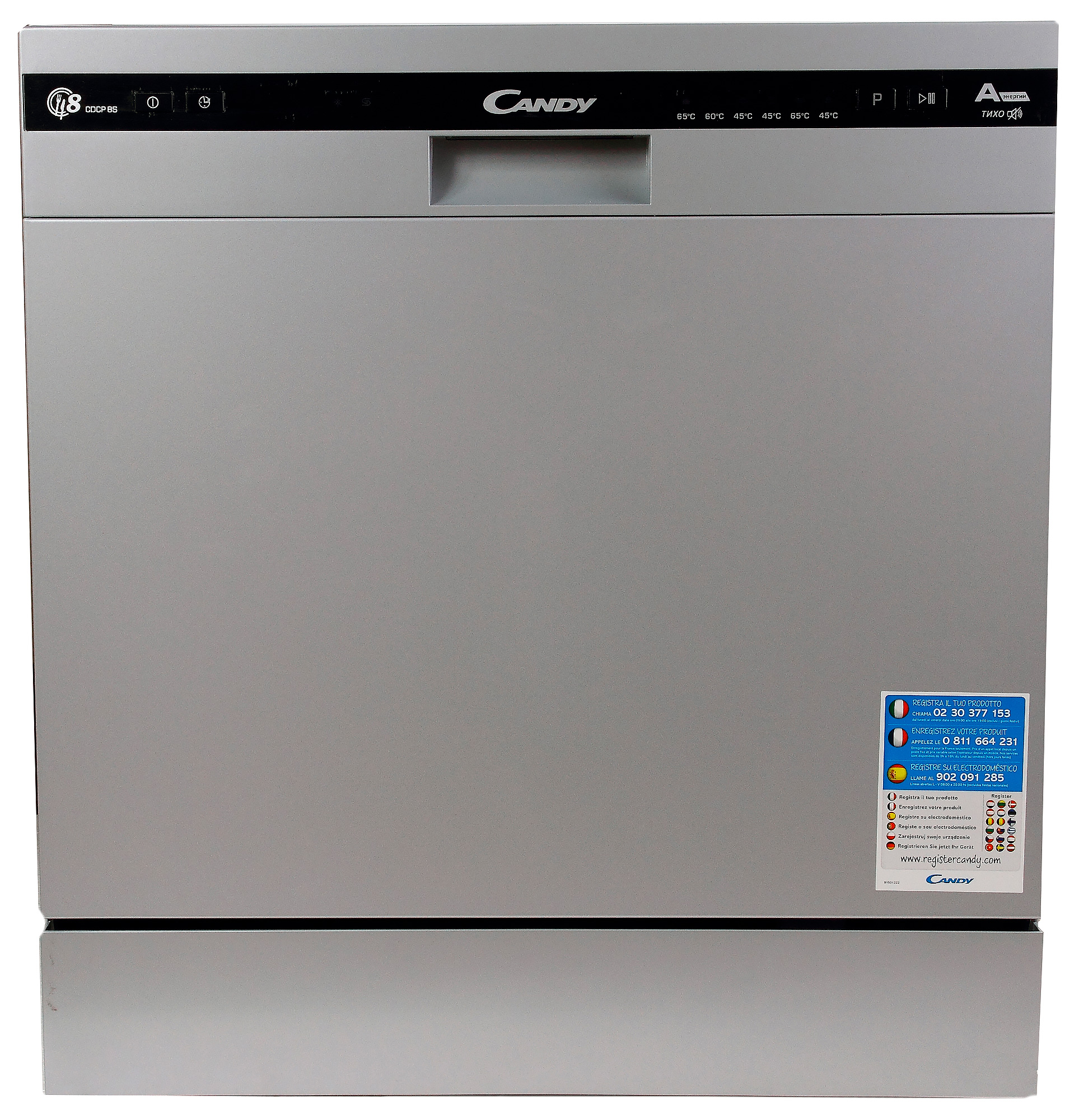 Панель управления у Candy CDCP 8ES-07 проста и в буквальном смысле линейна. Иконки понятны каждому, кто хоть раз пользовался посудомойкой. Слева на панели — кнопка включения и кнопка отсрочки старта. Упомянутая функция работает в пределах от 1 до 24 часов. За таймером располагается дисплей отображения оставшегося времени и состояния. Следом идут два световых индикатора: сигнал уровня ополаскивателя и предупредительный сигнал уровня соли.