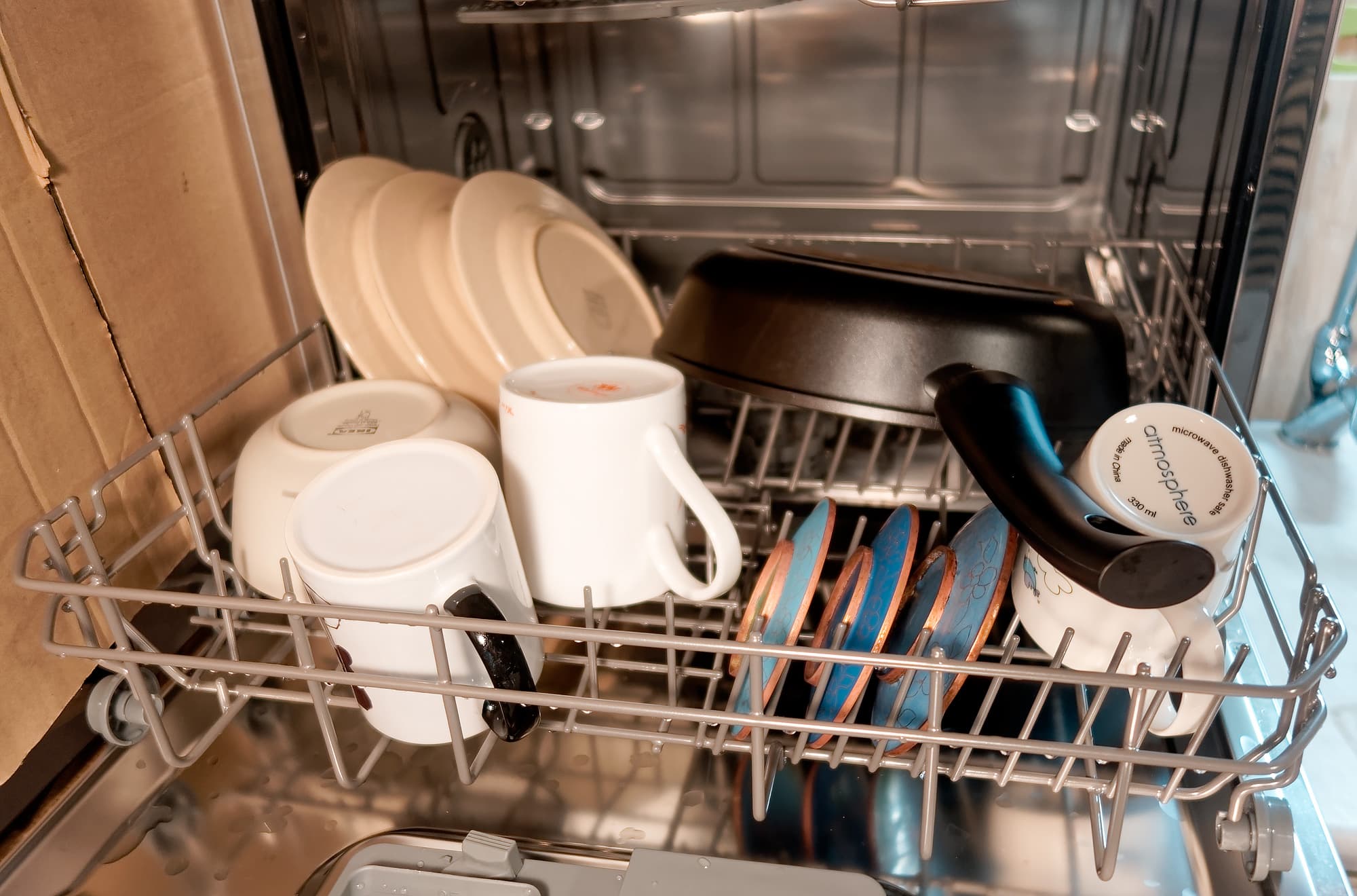 Это замечание касается, кстати, и вместительности устройства вообще. Из-за расположения верхней корзины прямо под потолком машины, туда не поставить высокие стаканы и бокалы: ничего выше блюдца и небольшой плошки.