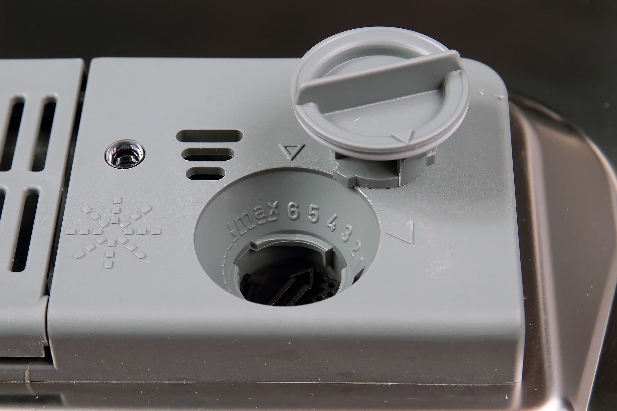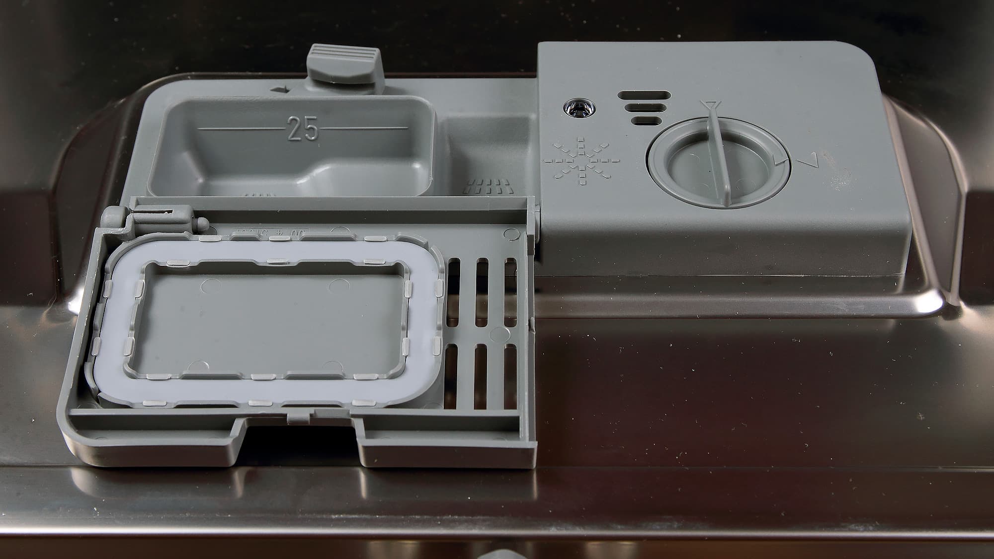 На дверце изнутри расположен дозатор с двумя отделениями. Слева — для моющего средства, с защелкивающейся крышкой. Справа — для ополаскивателя, с поворотной крышкой, регулировкой дозатора и индикатором количества ополаскивателя.